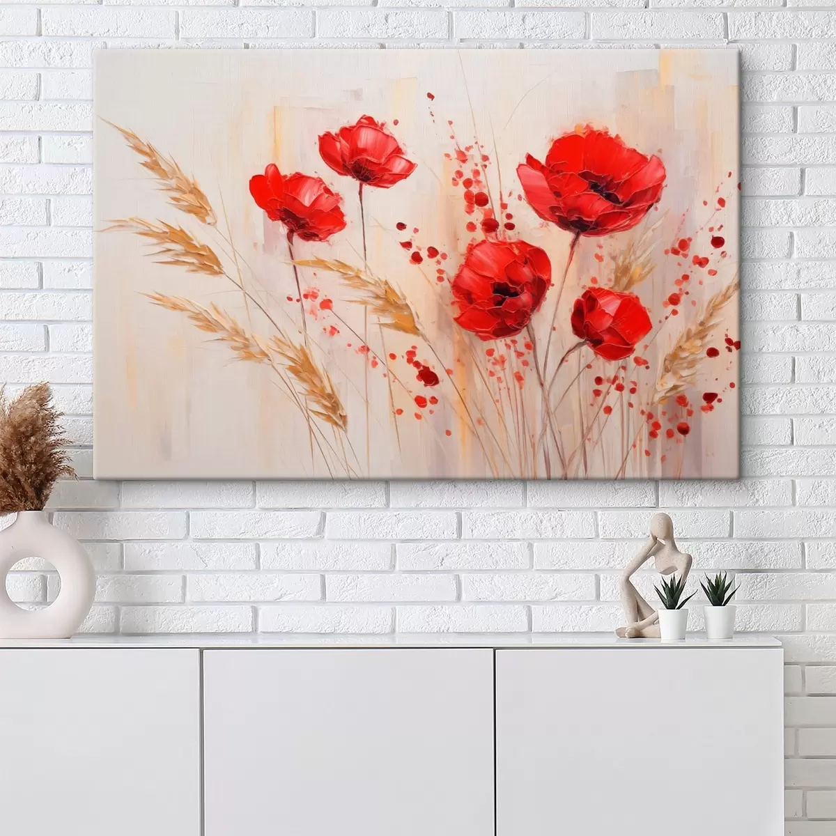 Pictură pe pânză Flori roșii de mac cu tulpini galbene de grâu, pe un fundal moale, neutru, cu stropi de vopsea roșie Nr s44926
