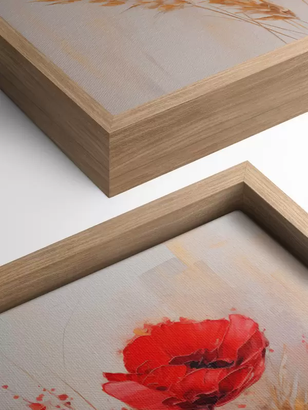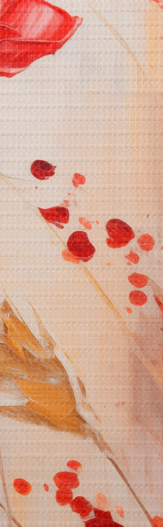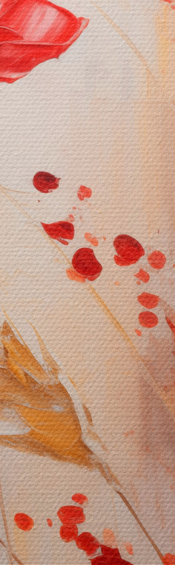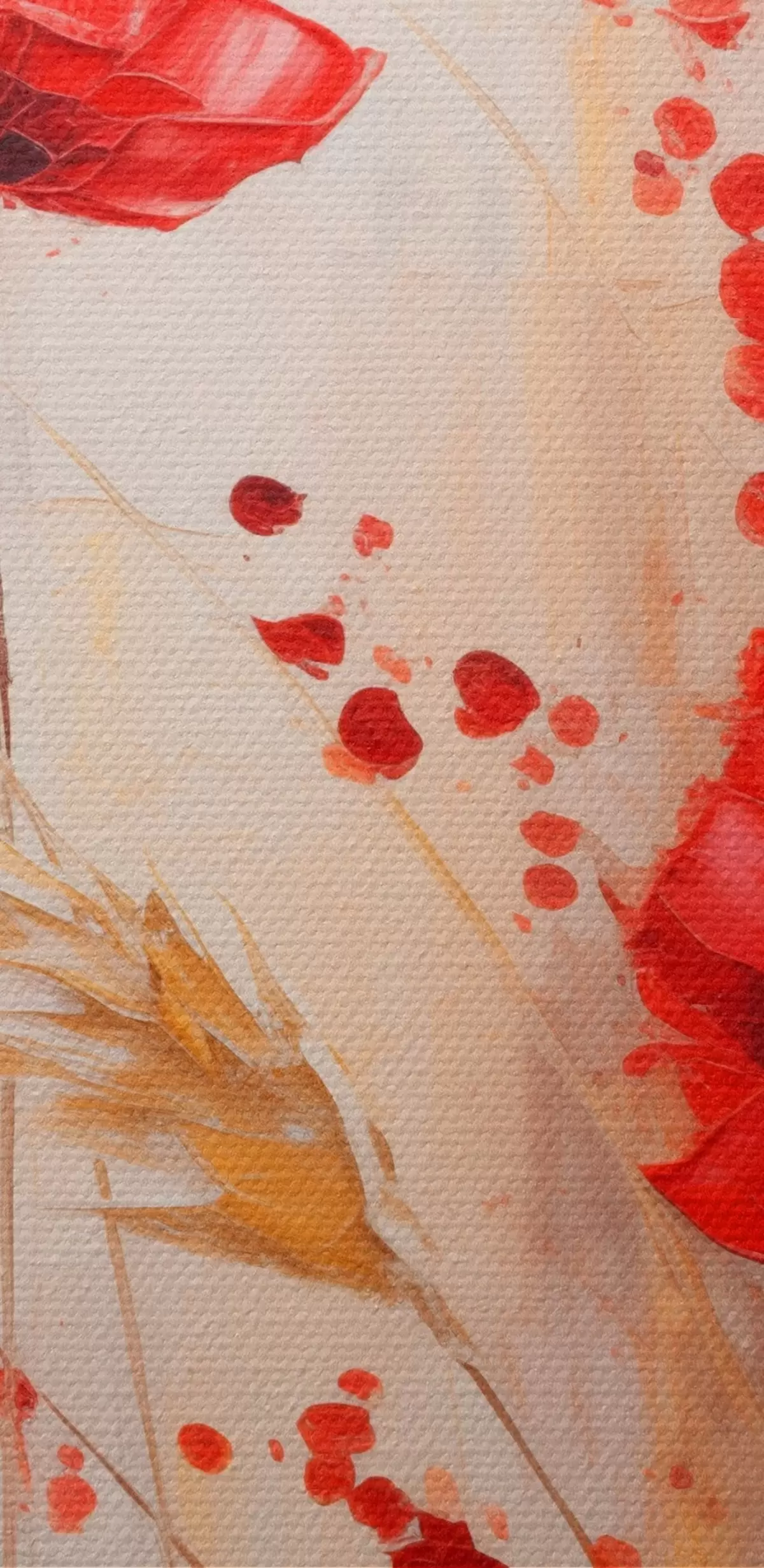 Tablouri Flori roșii de mac cu tulpini galbene de grâu, pe un fundal moale, neutru, cu stropi de vopsea roșie s44926