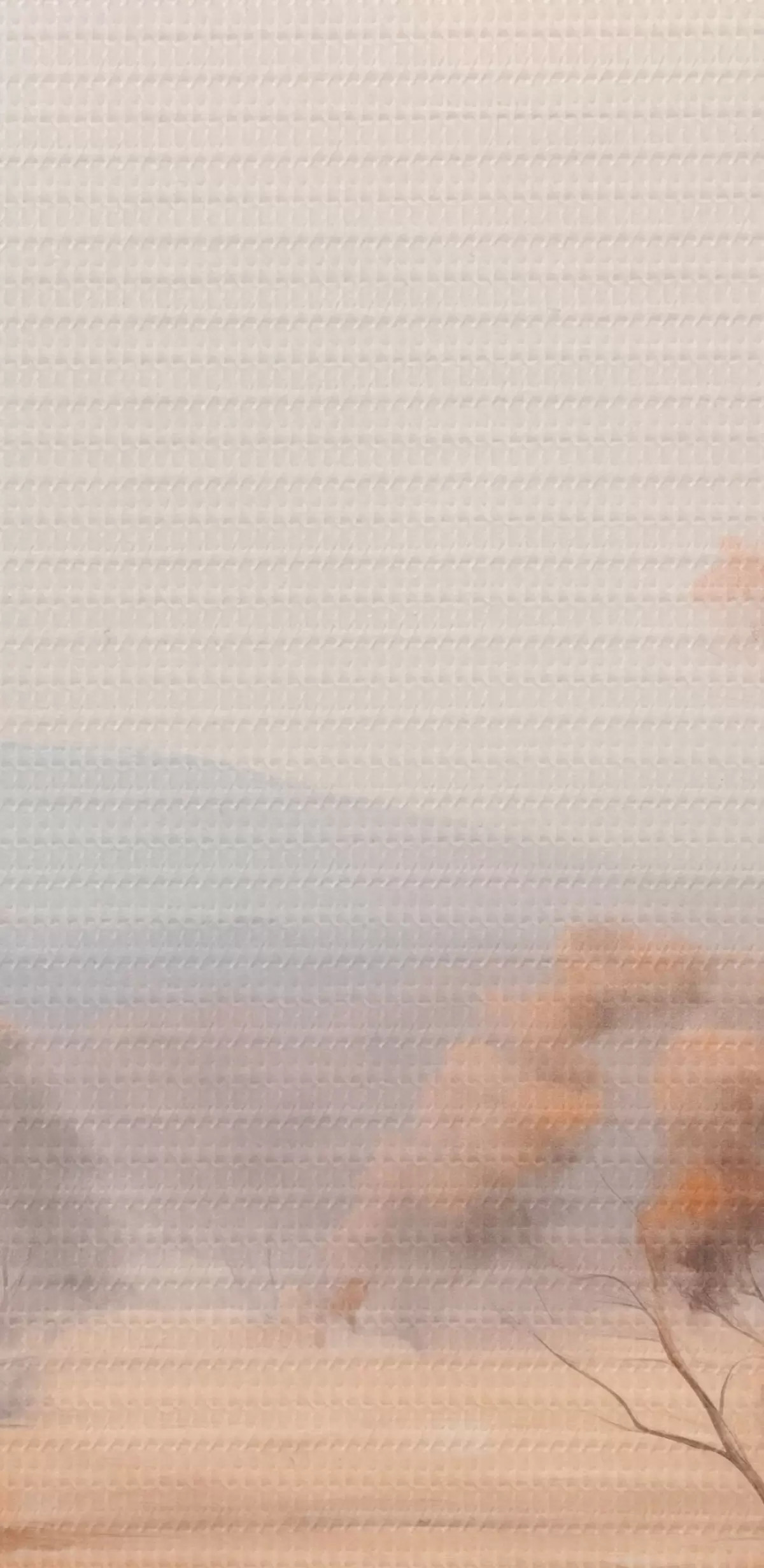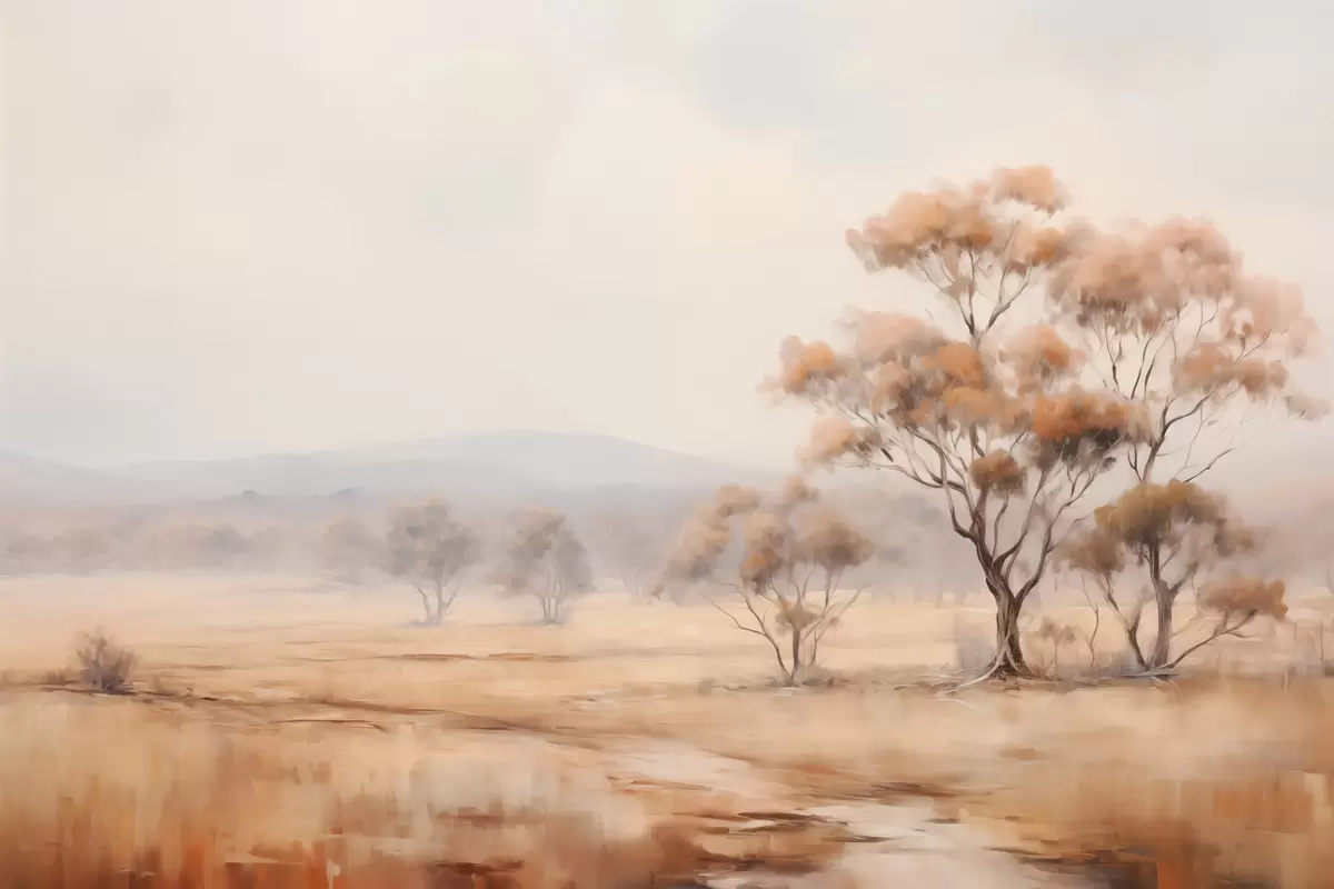 Tablouri Un câmp cu iarbă portocalie și câțiva copaci cu frunze portocalii, munți în fundal cu un cer noros s44927