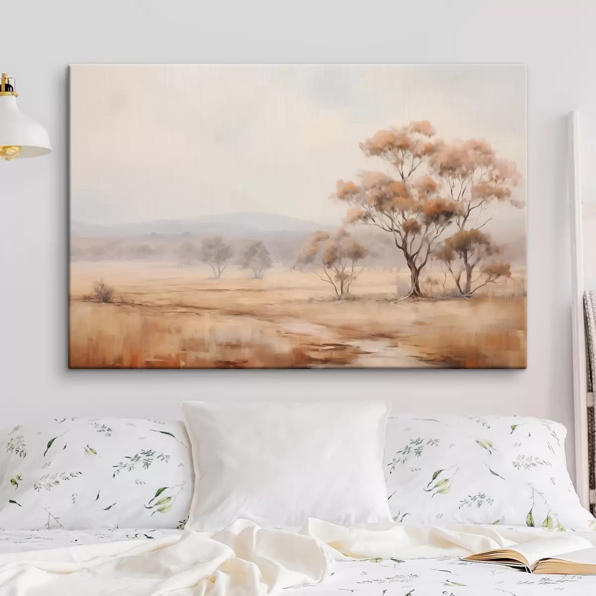 Pictură pe pânză Un câmp cu iarbă portocalie și câțiva copaci cu frunze portocalii, munți în fundal cu un cer noros Nr s44927