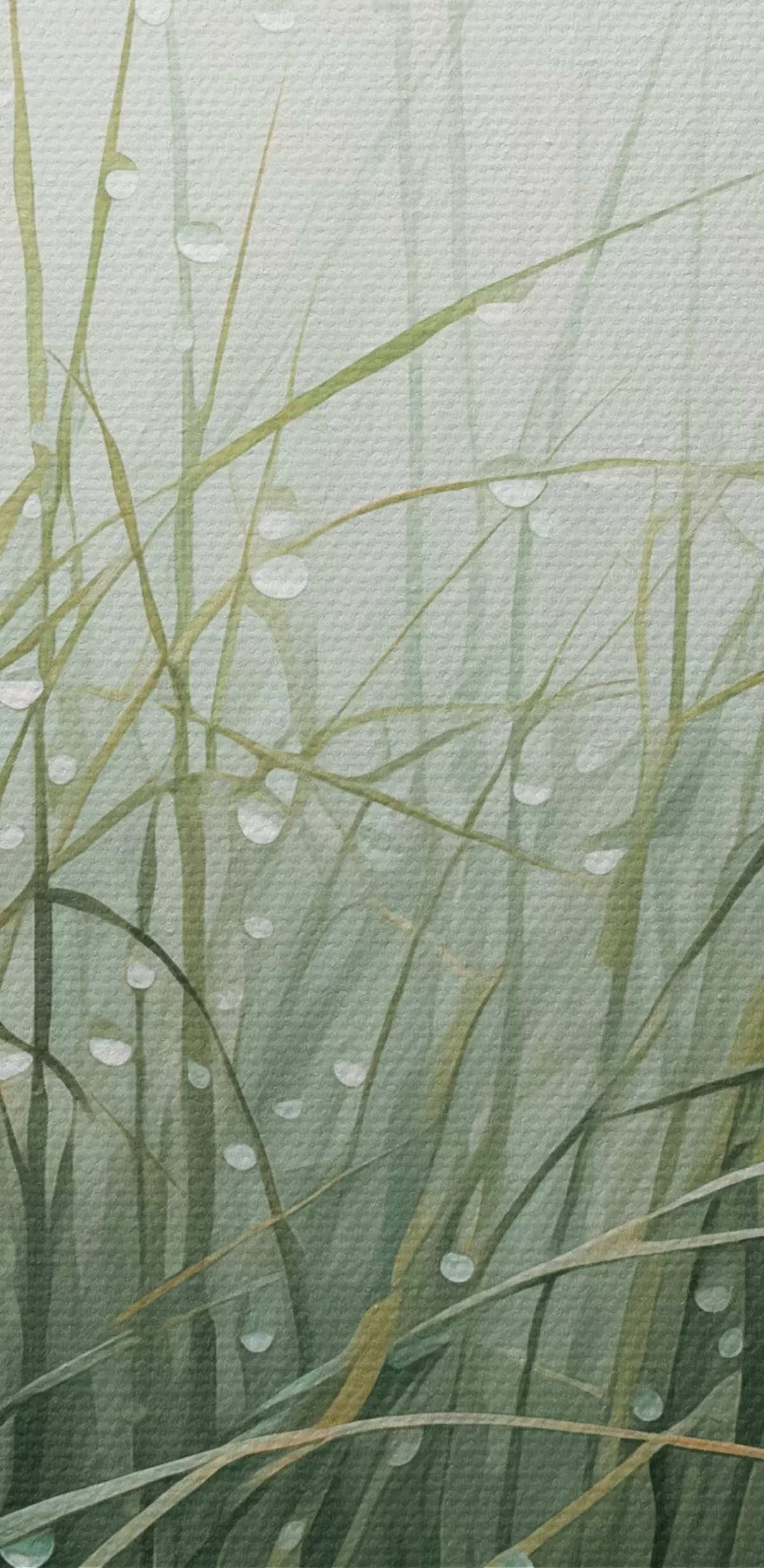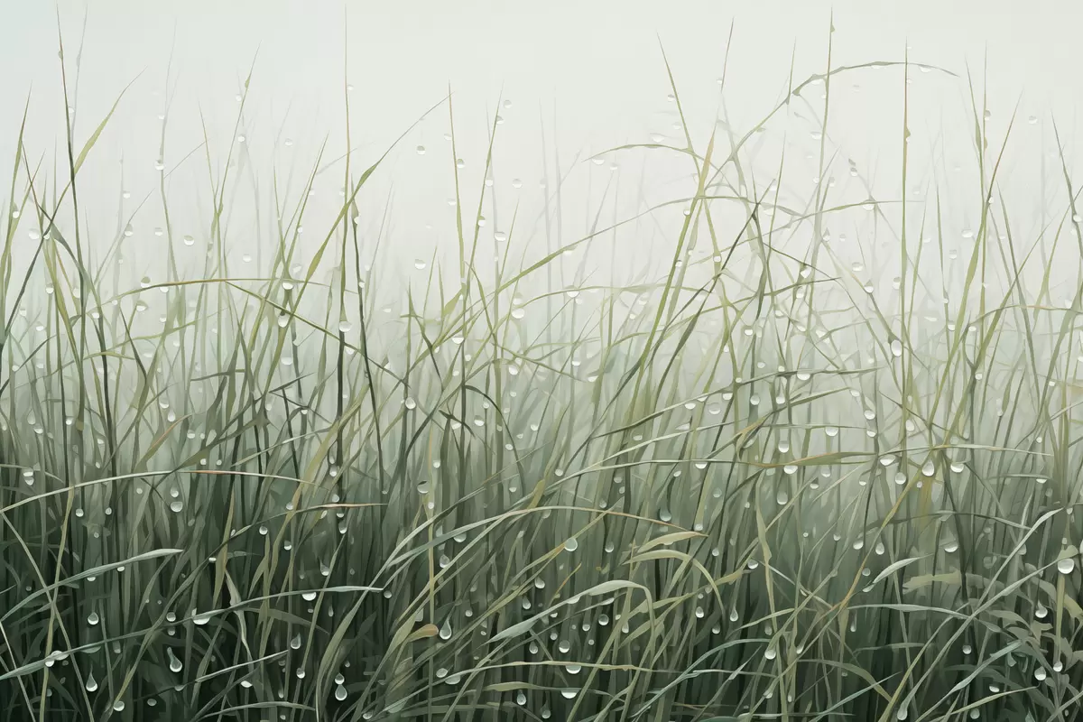 Tablouri Iarbă cu picături de apă, nuanțe verzi, lumină moale, fundal cețos, stil abstract minimalist texturat s44932