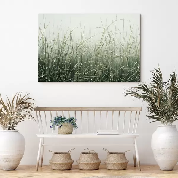 Pictură pe pânză Iarbă cu picături de apă, nuanțe verzi, lumină moale, fundal cețos, stil abstract minimalist texturat Nr s44932
