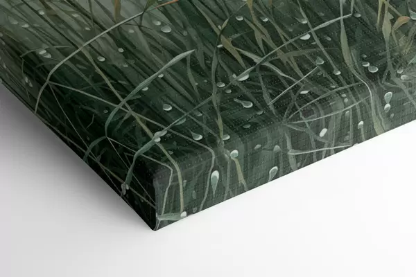 Pictură pe pânză Iarbă cu picături de apă, nuanțe verzi, lumină moale, fundal cețos, stil abstract minimalist texturat Nr s44932