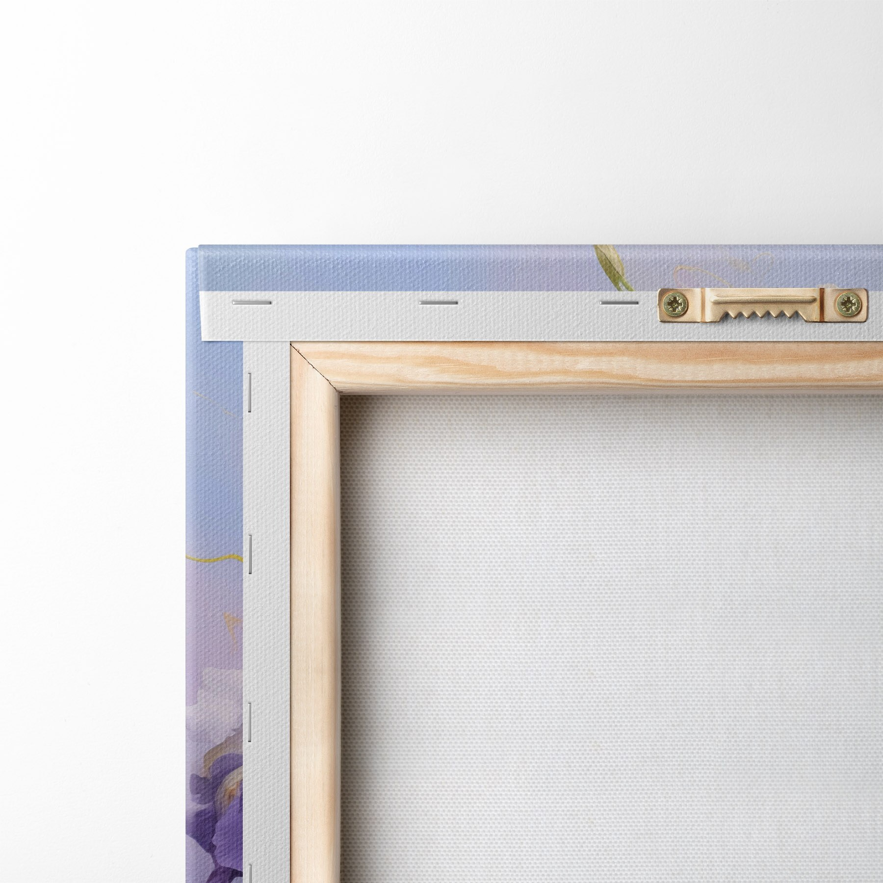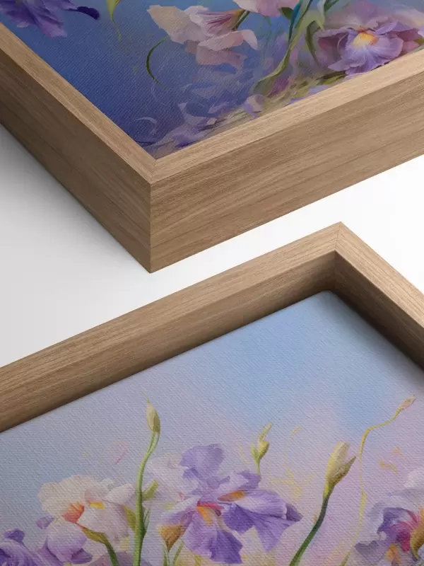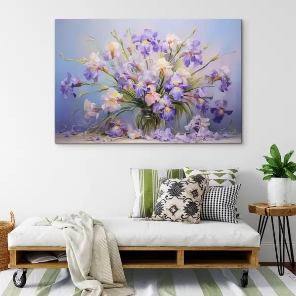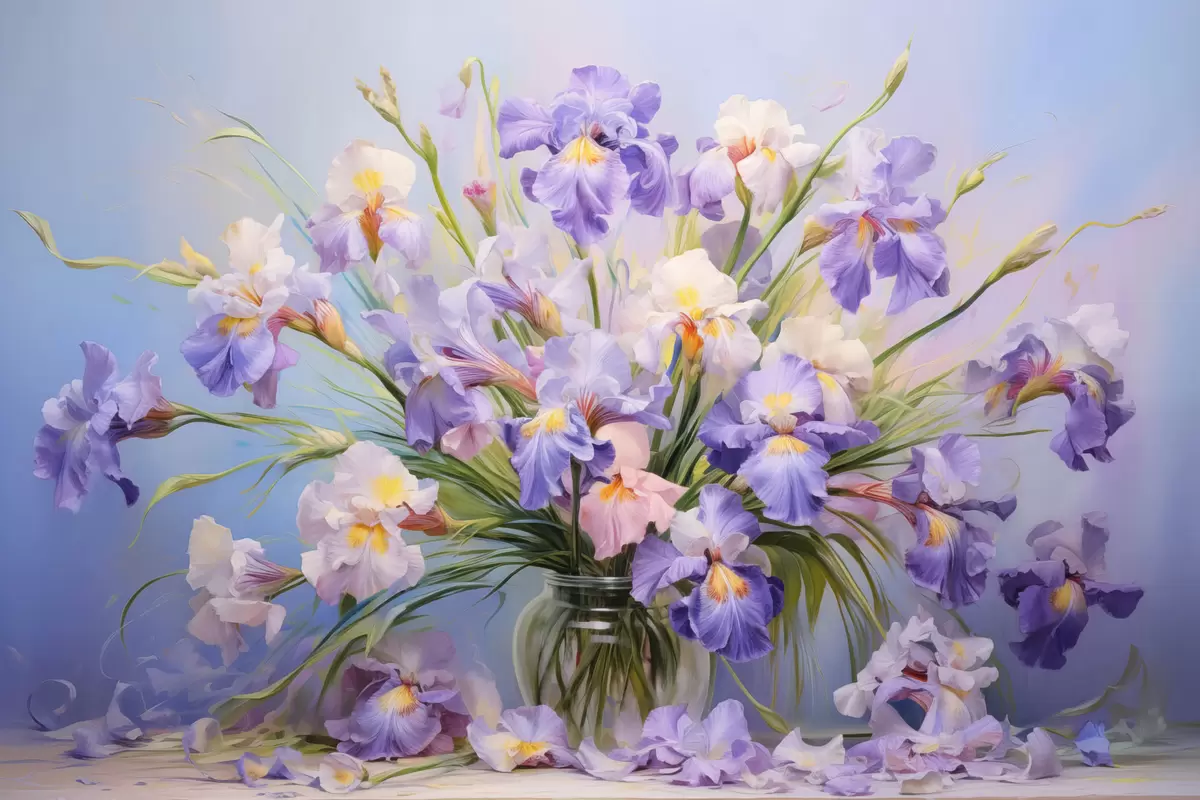 Pictură pe pânză O vază cu multe iriși pastelate, câteva petale împrăștiate pe masă, fundal moale pastel cu tonuri de albastru și roz Nr s44933