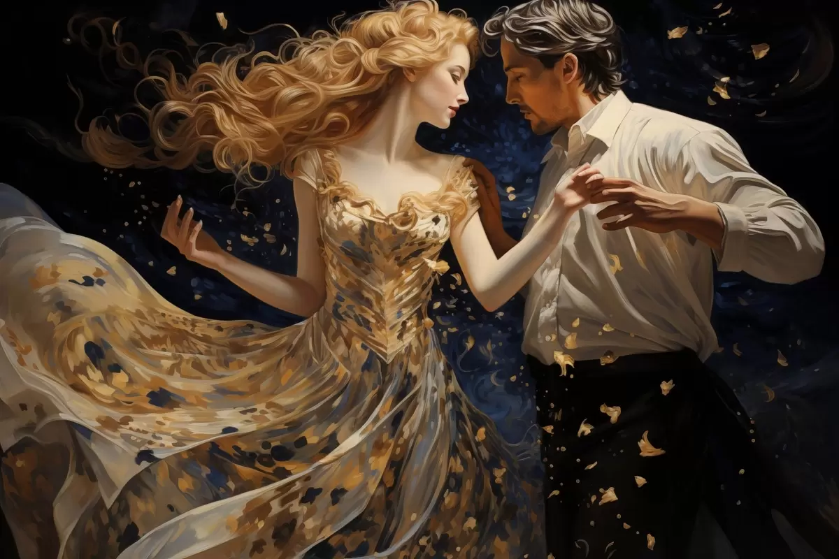 Tablouri Cuplu în mișcare în tonuri galben-albastru în stil pictură s44940