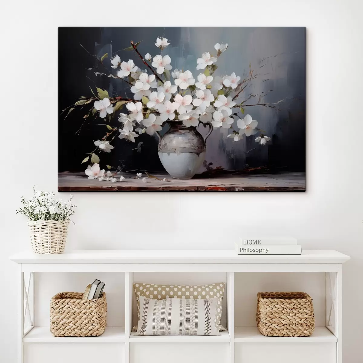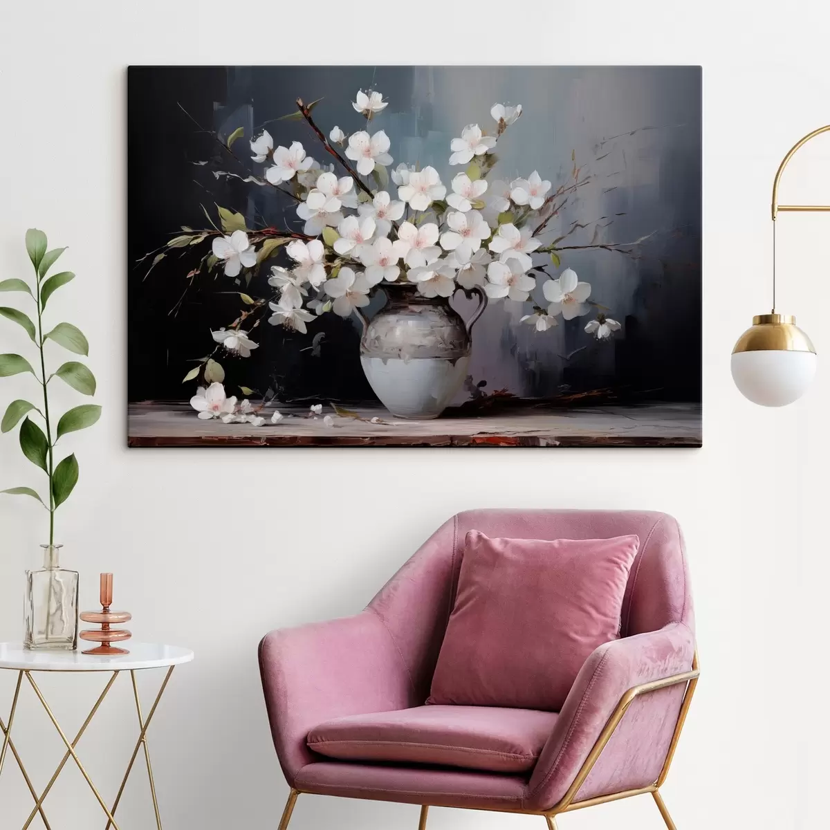 Tablouri Ramuri înflorite într-o vază pe un fundal întunecat în stil pitoresc s44949