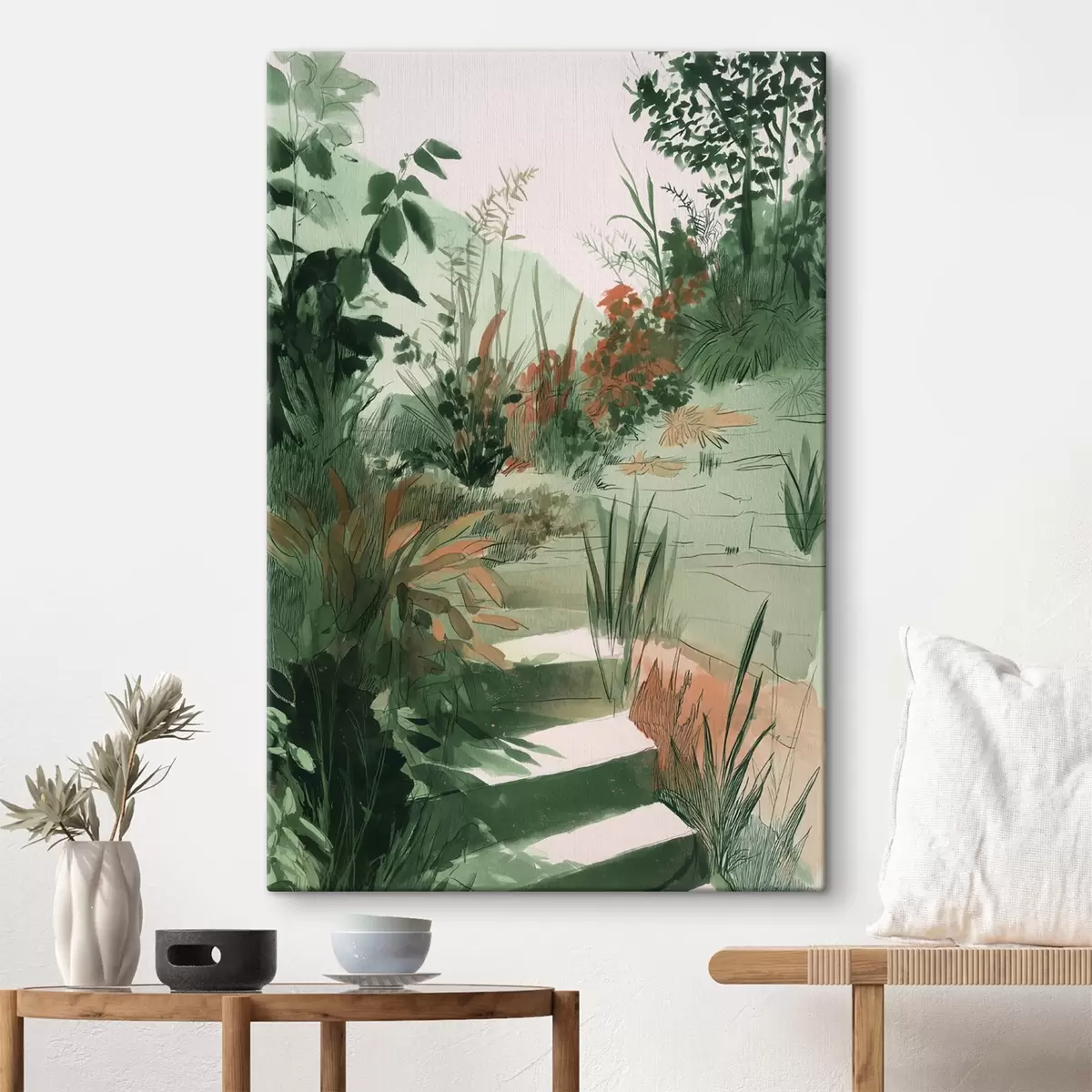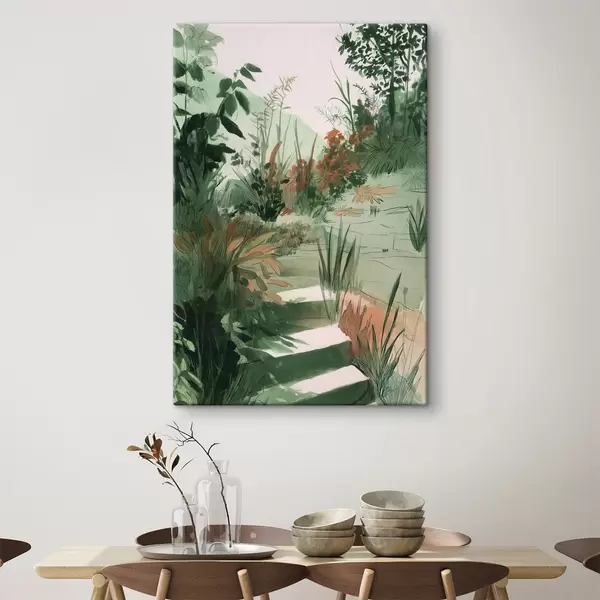 Pictură pe pânză Grădină orientală cu tufișuri și copaci, culori verzi Nr s44982