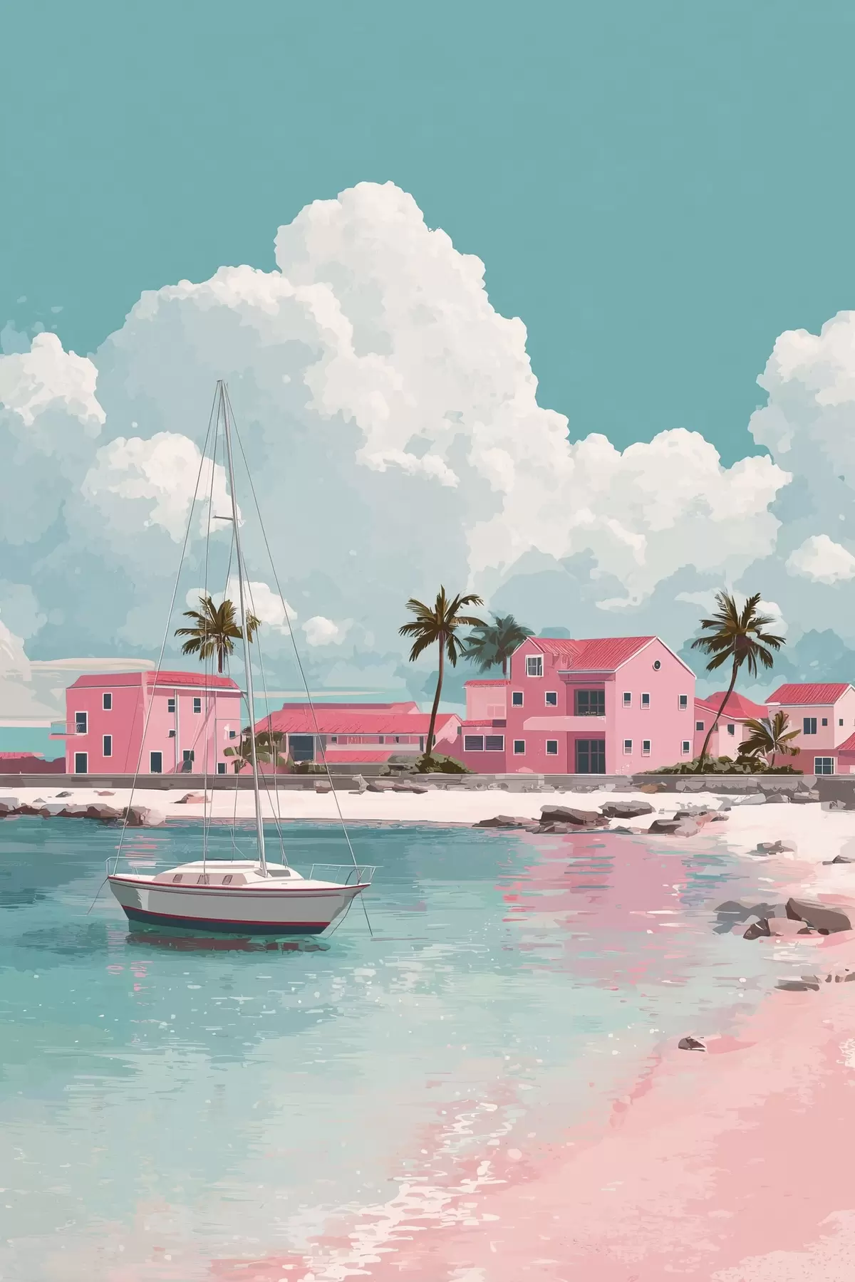Tablouri Plajă roz cu soare strălucitor, barcă cu pânze și case s44986
