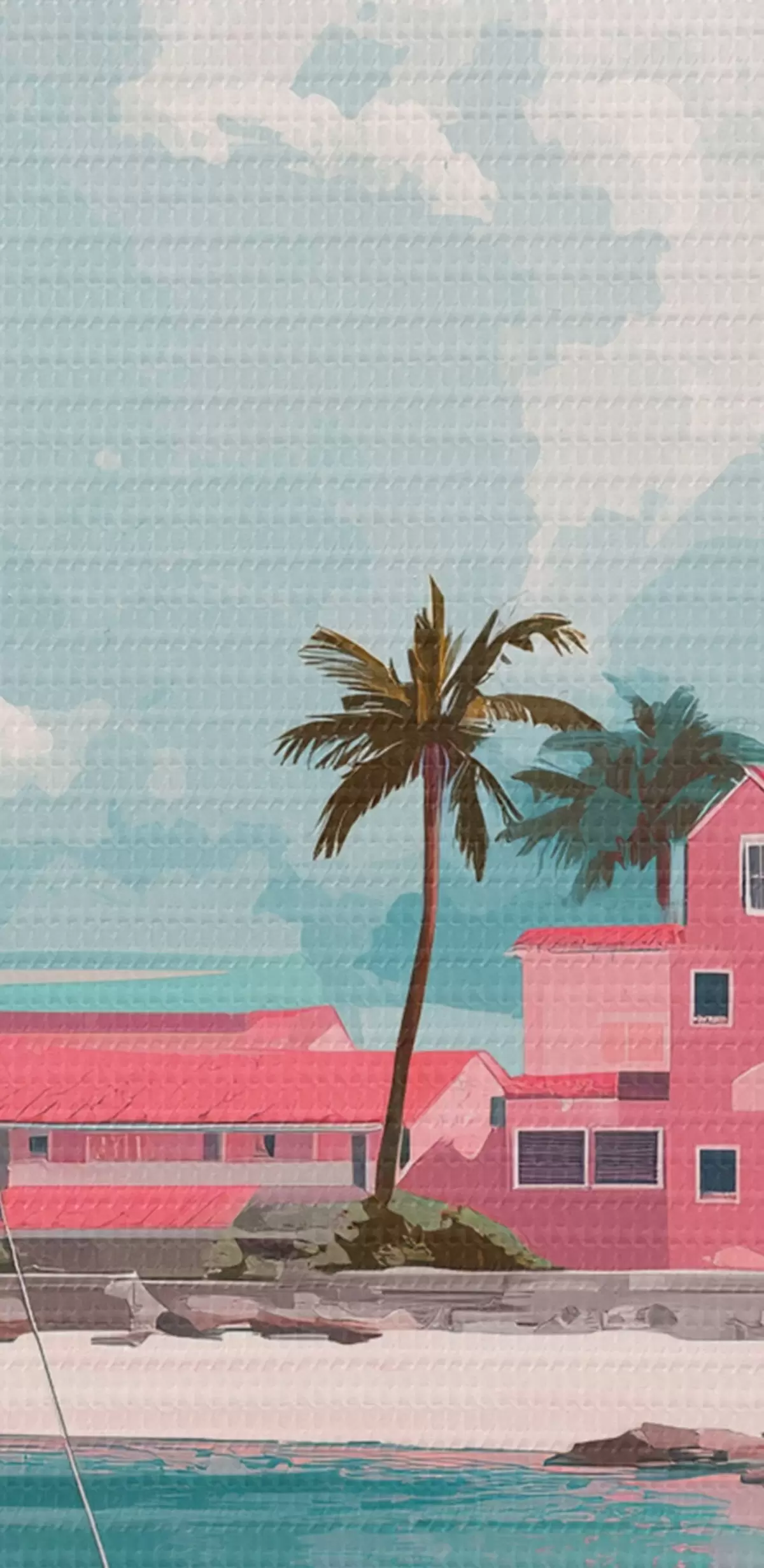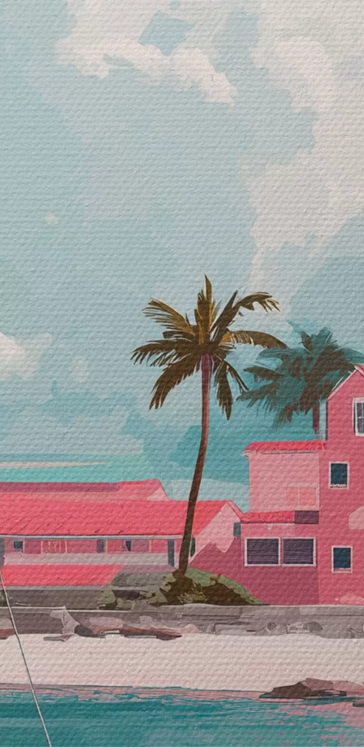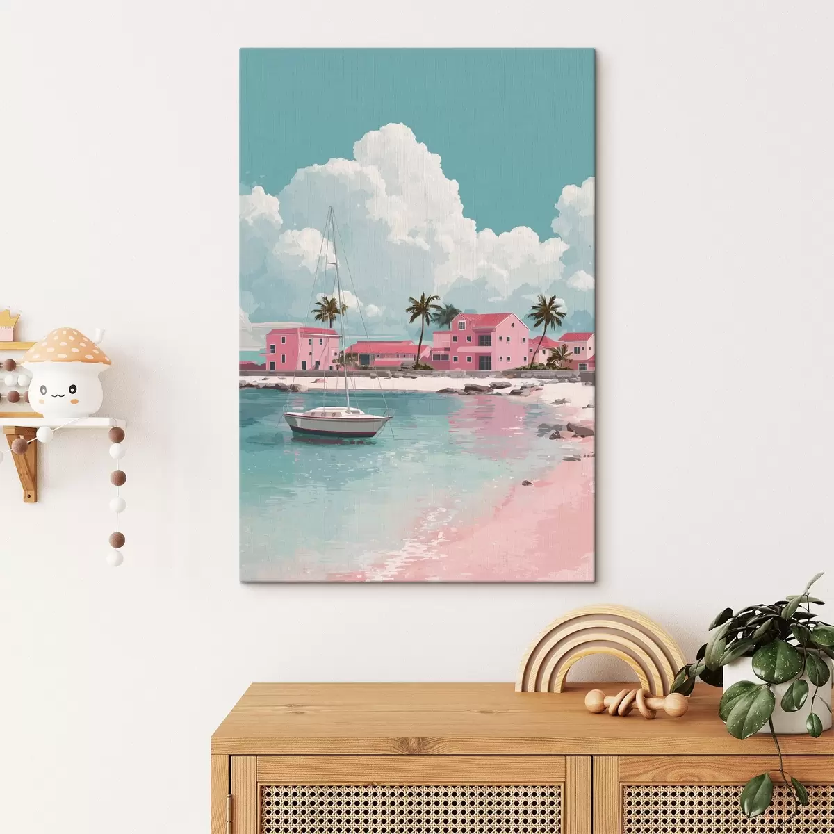 Pictură pe pânză Plajă roz cu soare strălucitor, barcă cu pânze și case Nr s44986