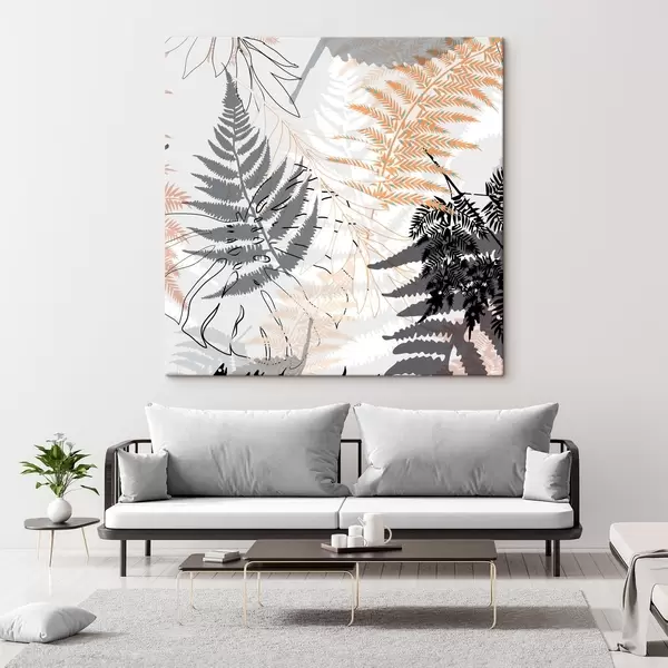 Pictură pe pânză ferigă, frunze abstracte, model, design plat, contrast, tonuri de gri, botanic, suprapunere Nr s45101