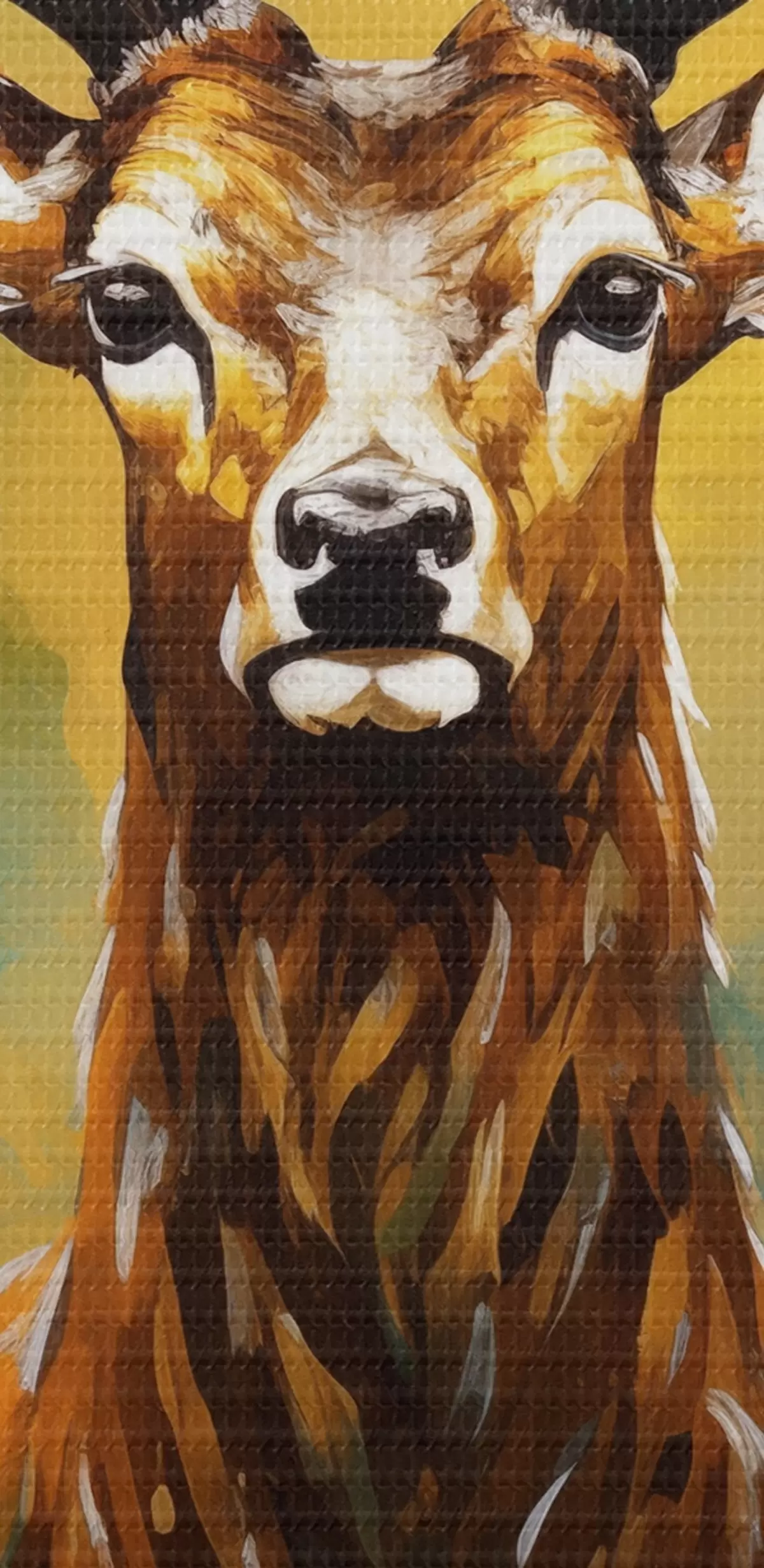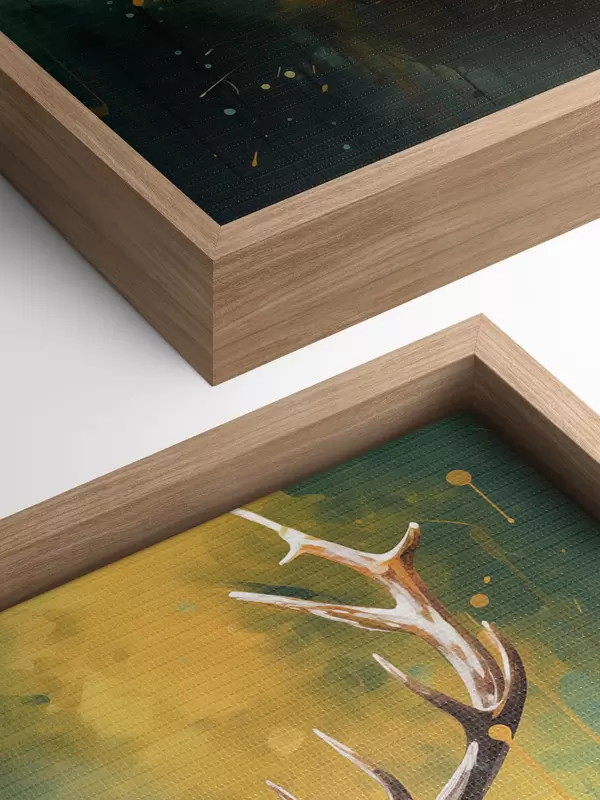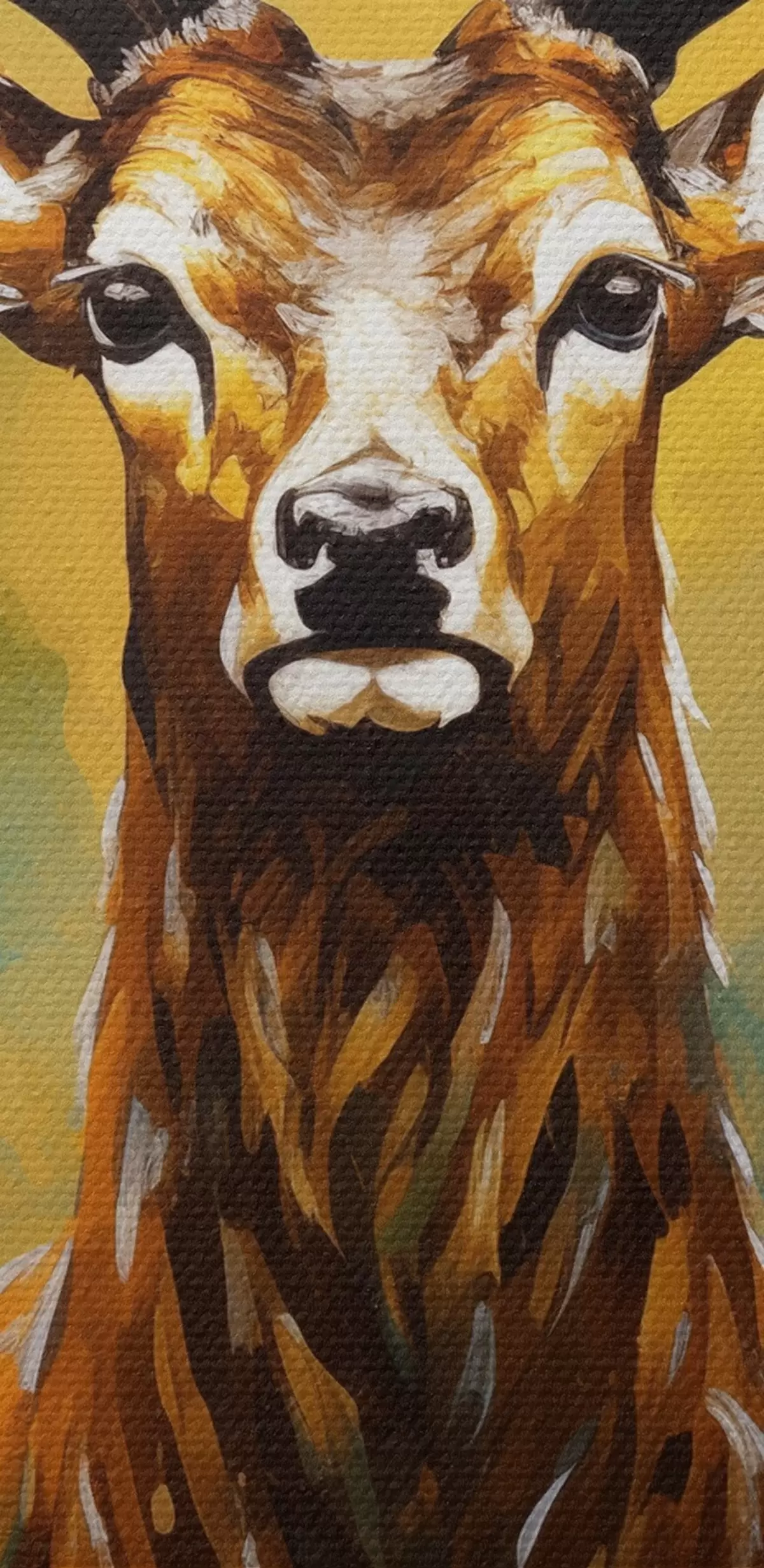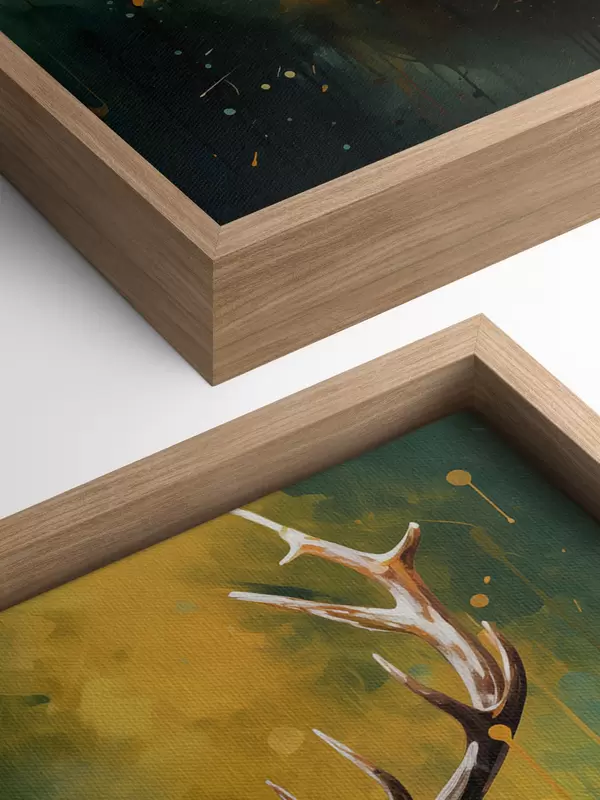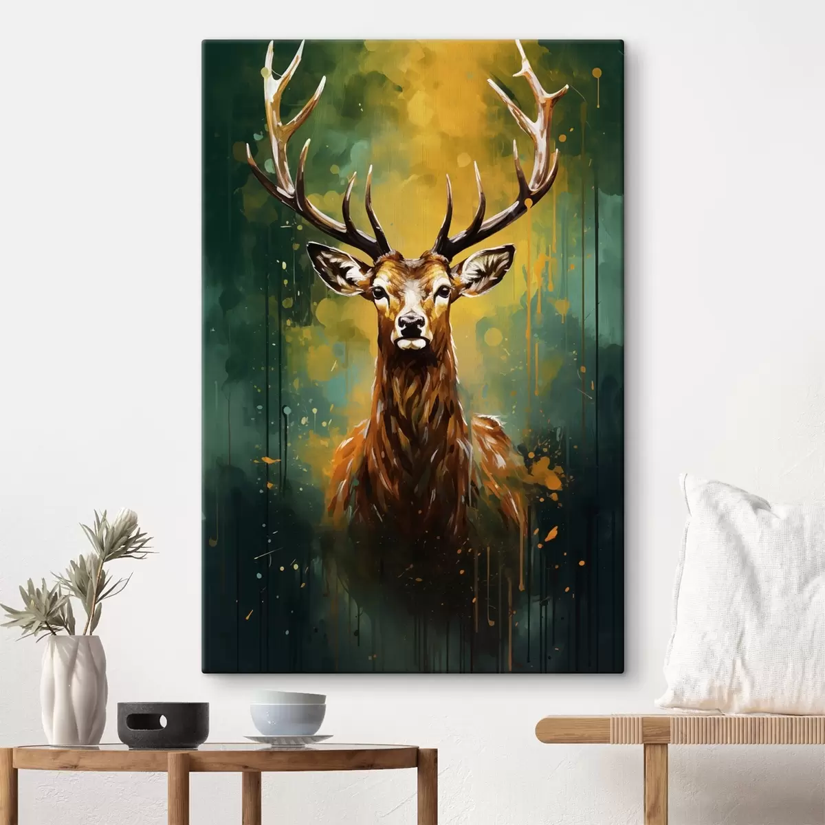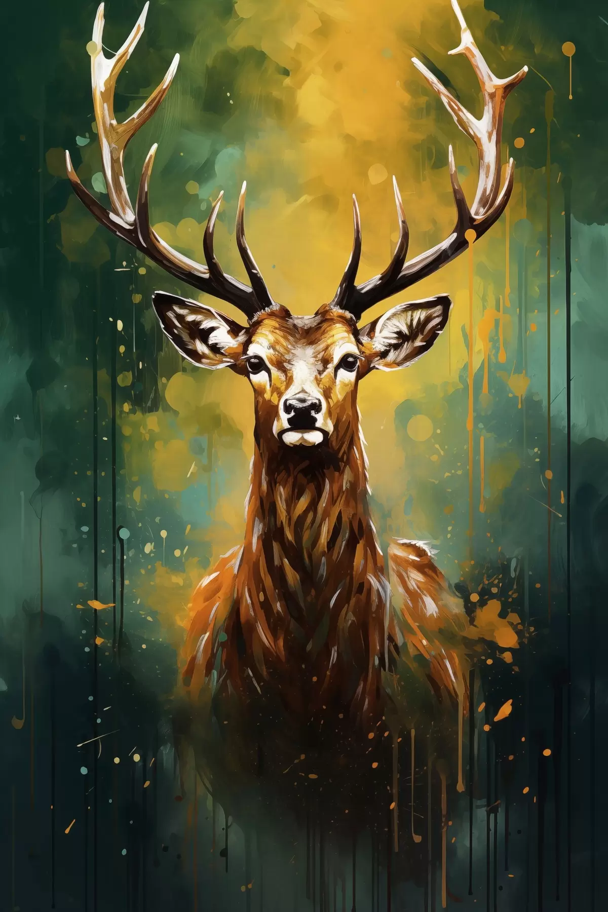 Pictură pe pânză cerb, coarne, verde pădure, strop portocaliu, portret animal, picurare, îndrăzneț, faună Nr s45111