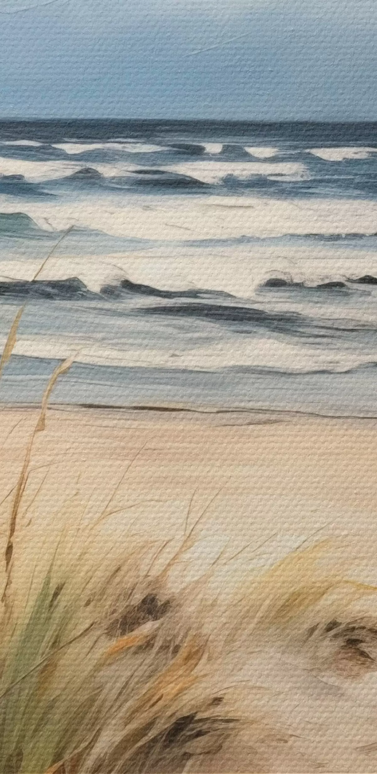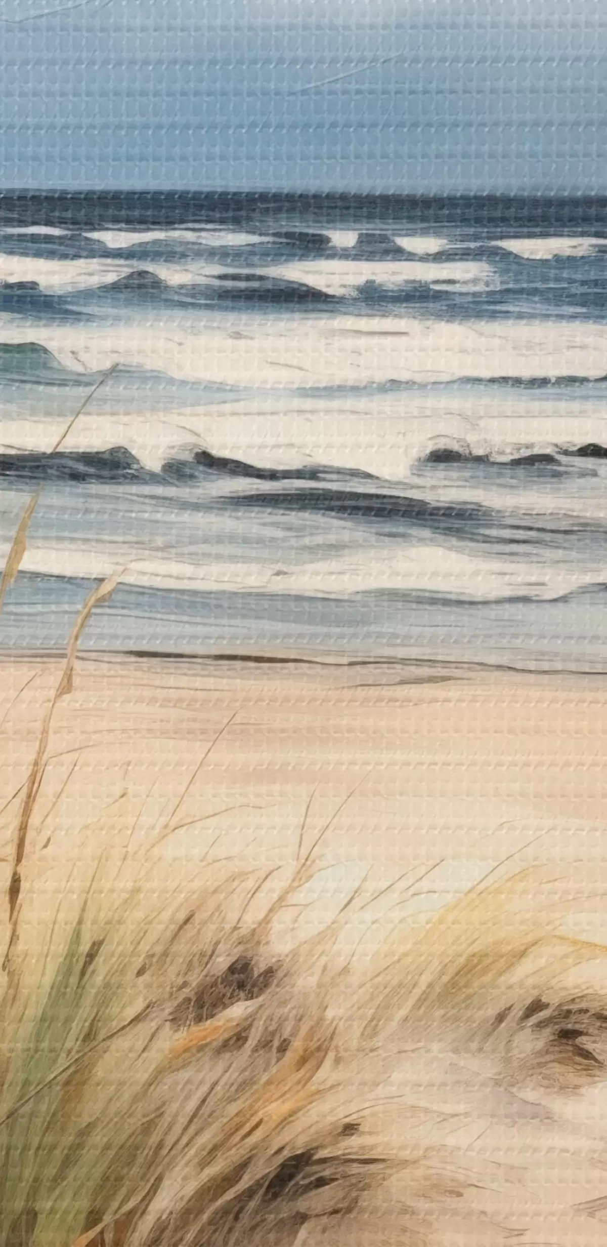 Pictură pe pânză O plajă nisipoasă cu iarbă înaltă în prim-plan, oceanul cu valuri și un cer înnorat în fundal Nr s45173