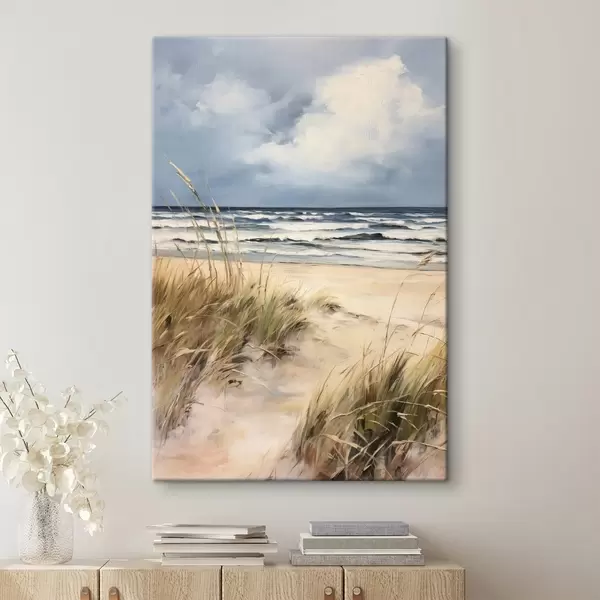 Pictură pe pânză O plajă nisipoasă cu iarbă înaltă în prim-plan, oceanul cu valuri și un cer înnorat în fundal Nr s45173
