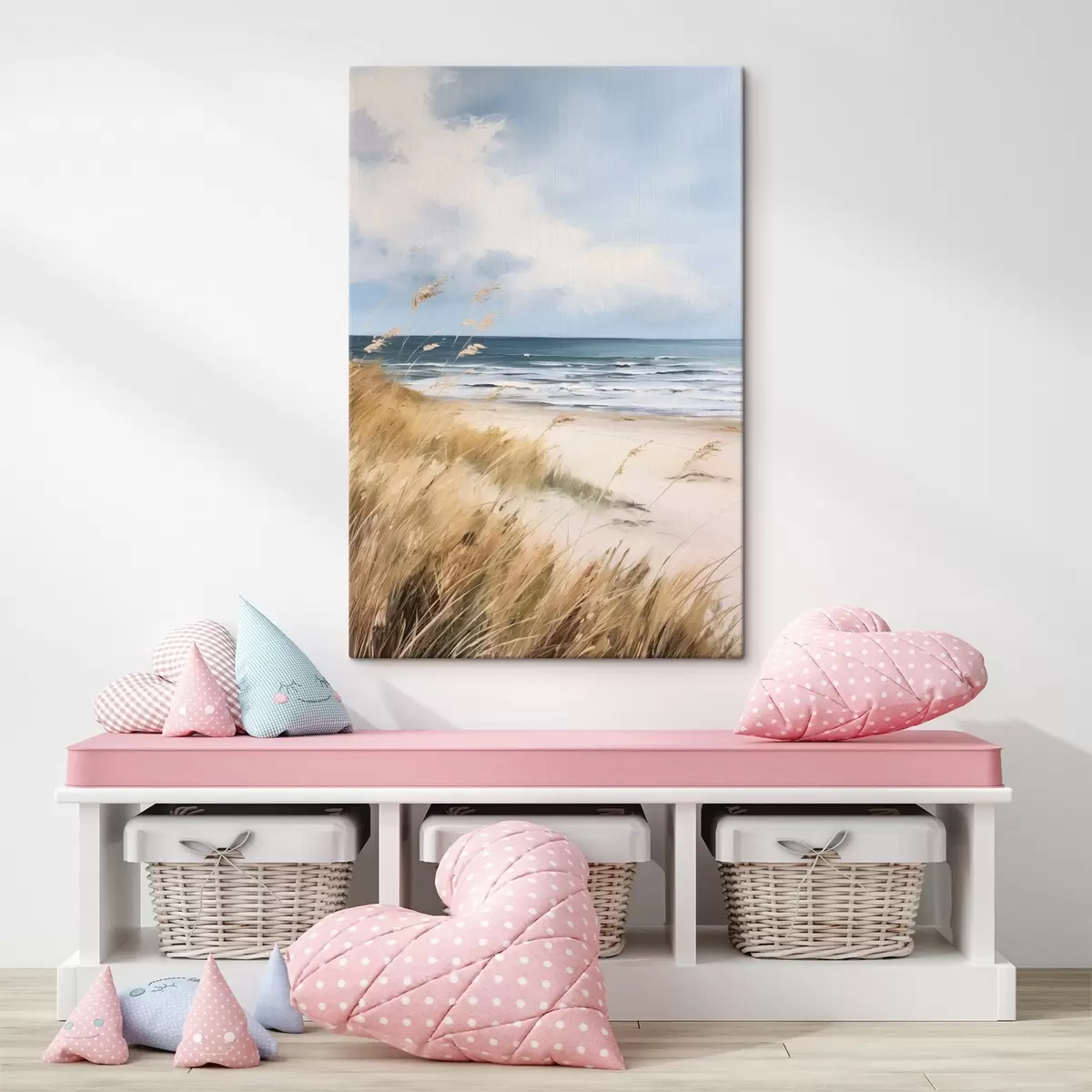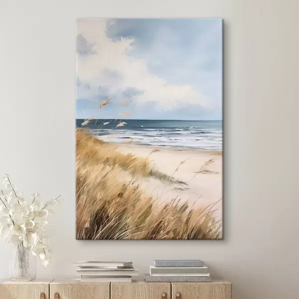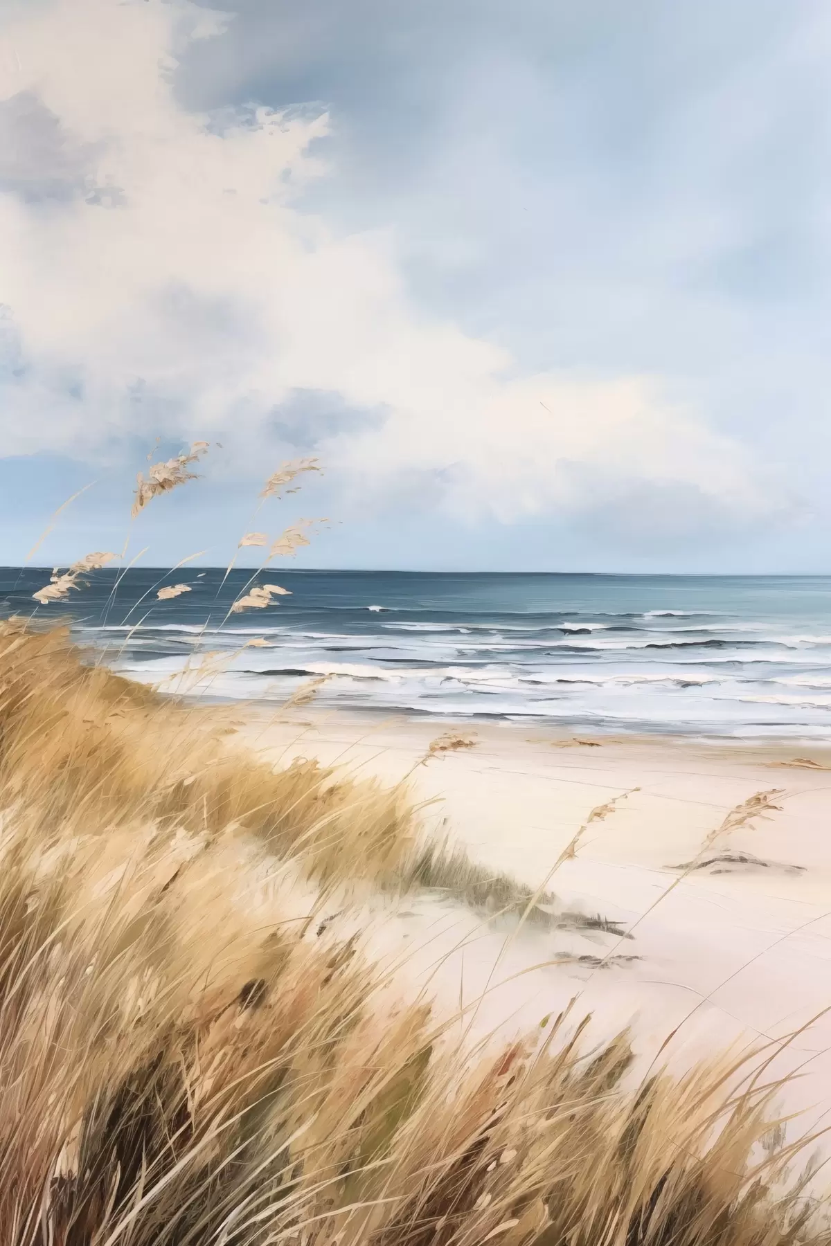 Pictură pe pânză O plajă nisipoasă cu iarbă înaltă în prim-plan, oceanul cu valuri și un cer înnorat în fundal Nr s45174
