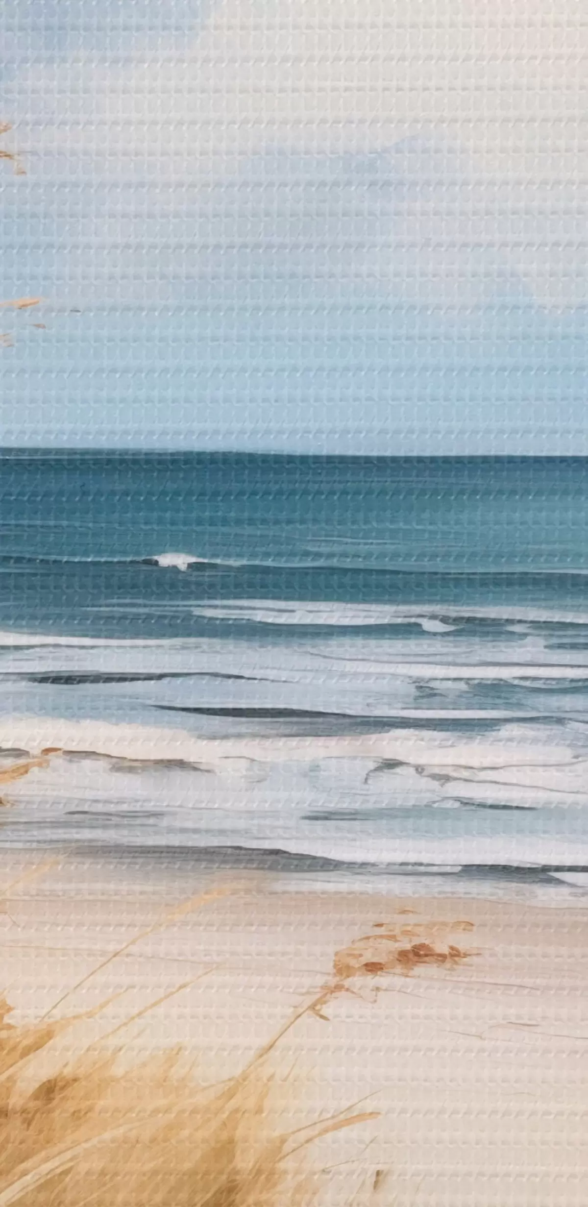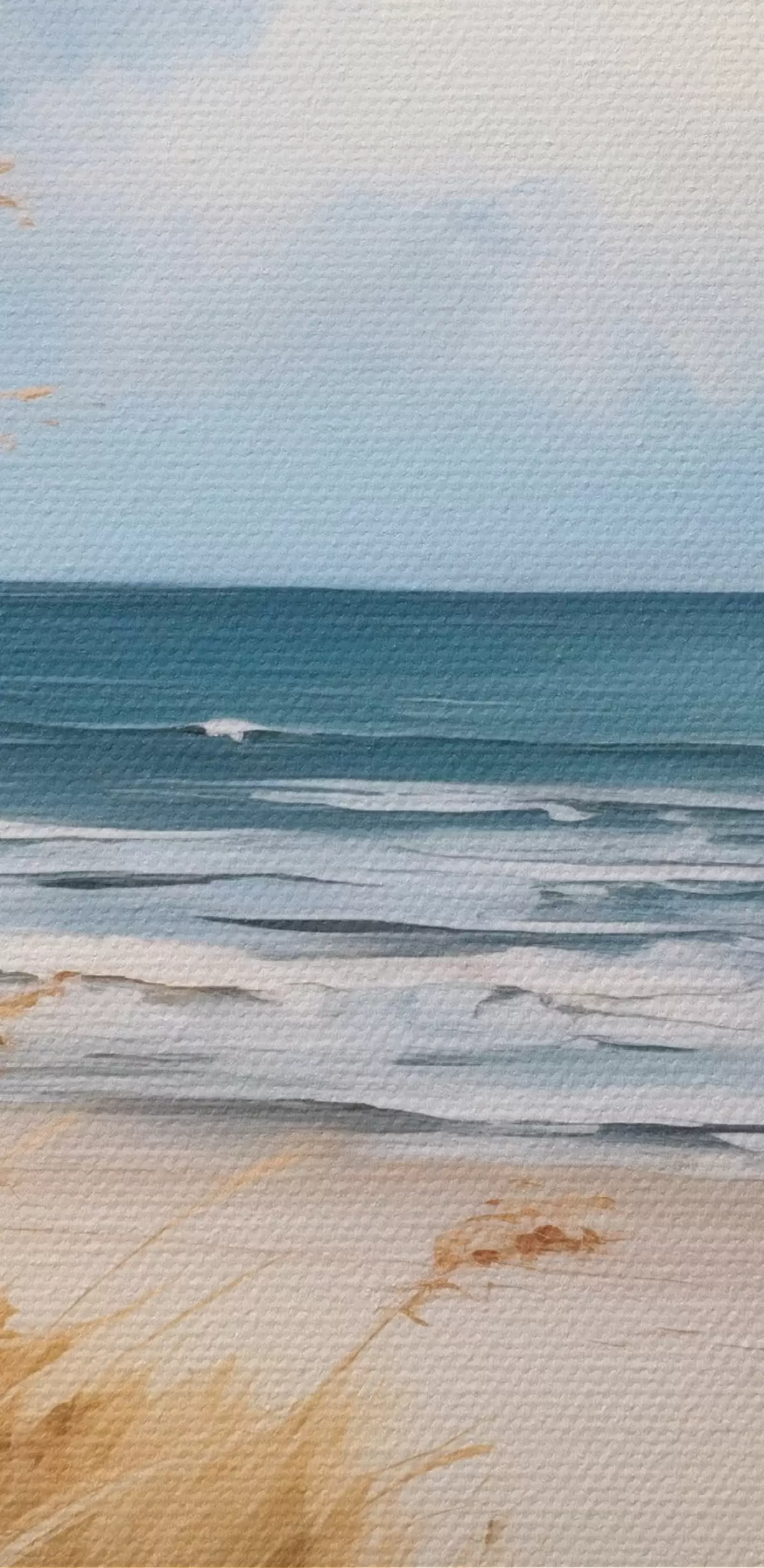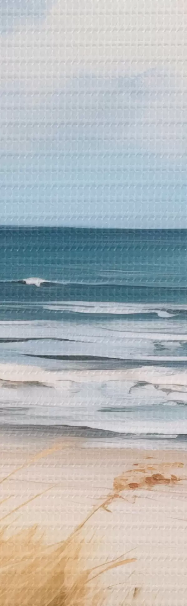 Pictură pe pânză O plajă nisipoasă cu iarbă înaltă în prim-plan, oceanul cu valuri și un cer înnorat în fundal Nr s45174