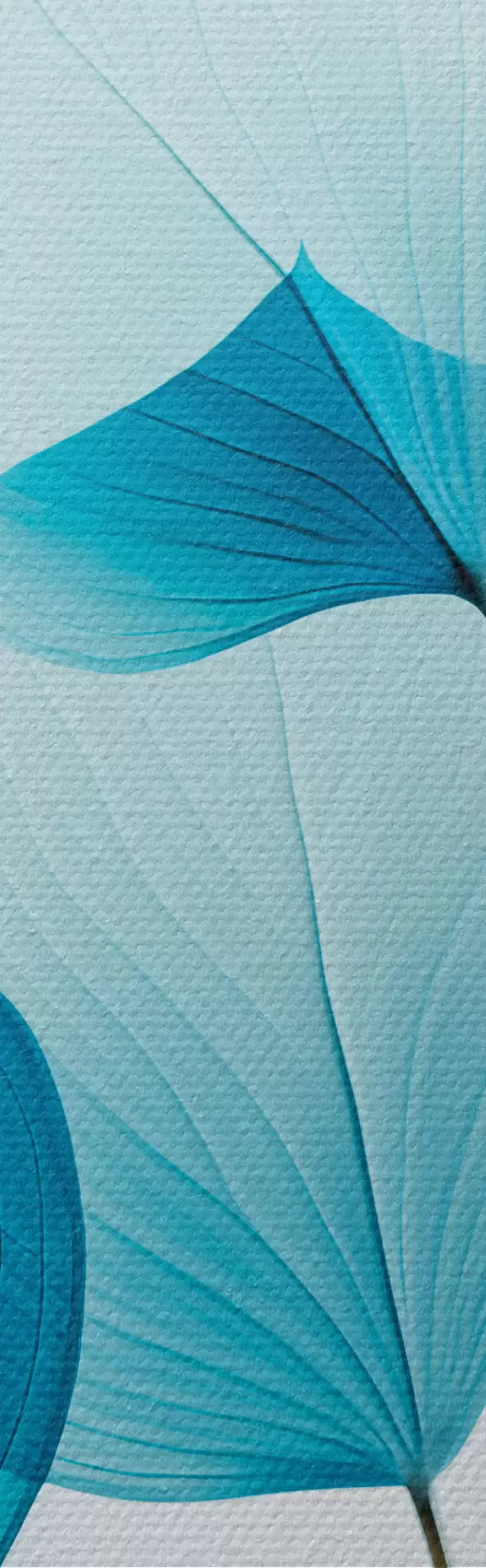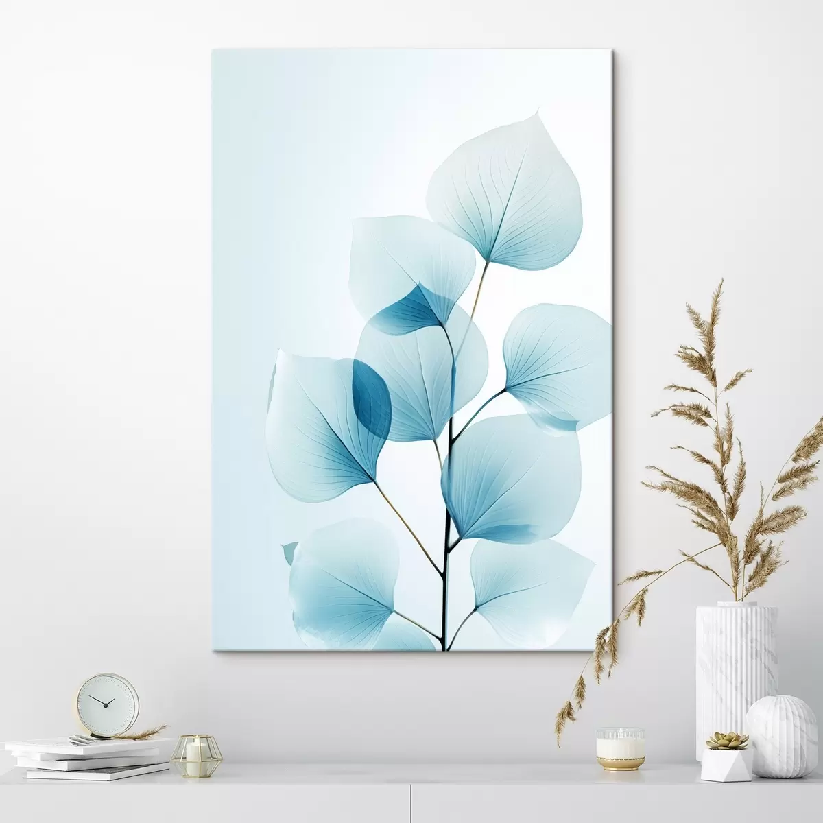 Pictură pe pânză Creangă cu frunze albastre translucide, vene delicate vizibile, compoziție ușoară și calmă, estetică minimalistă Nr s45175