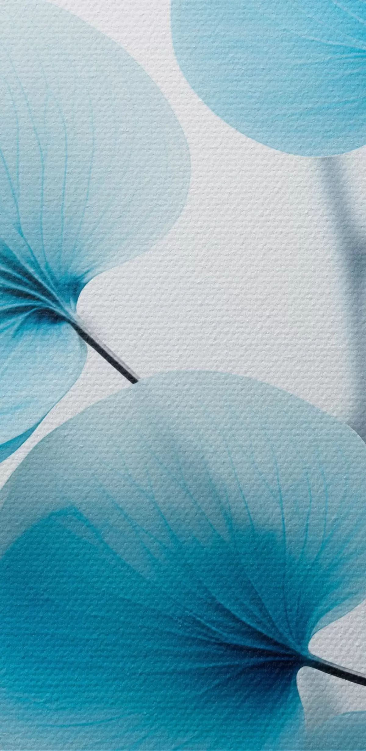 Pictură pe pânză Creangă cu frunze albastre translucide, vene delicate vizibile, compoziție ușoară și calmă, estetică minimalistă Nr s45176