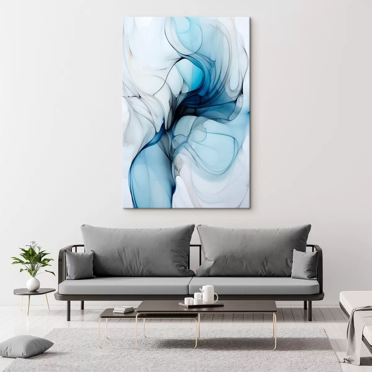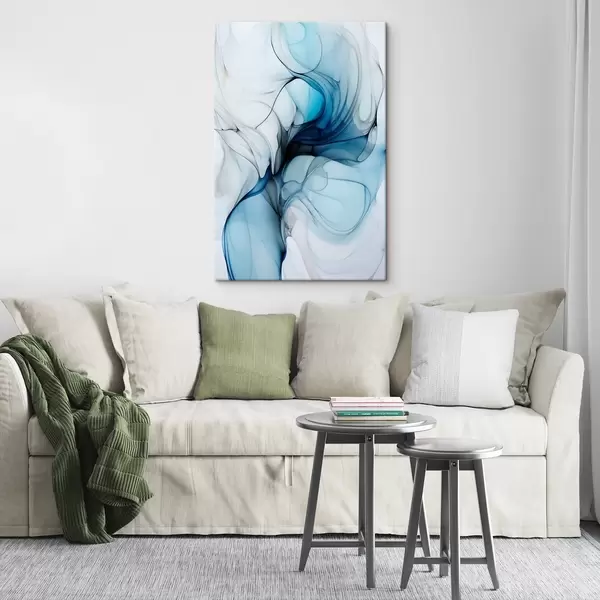 Pictură pe pânză Compoziție abstractă cu linii fluide și petale translucide în nuanțe de albastru, alb și bej, imitație de cerneală alcoolică Nr s45178