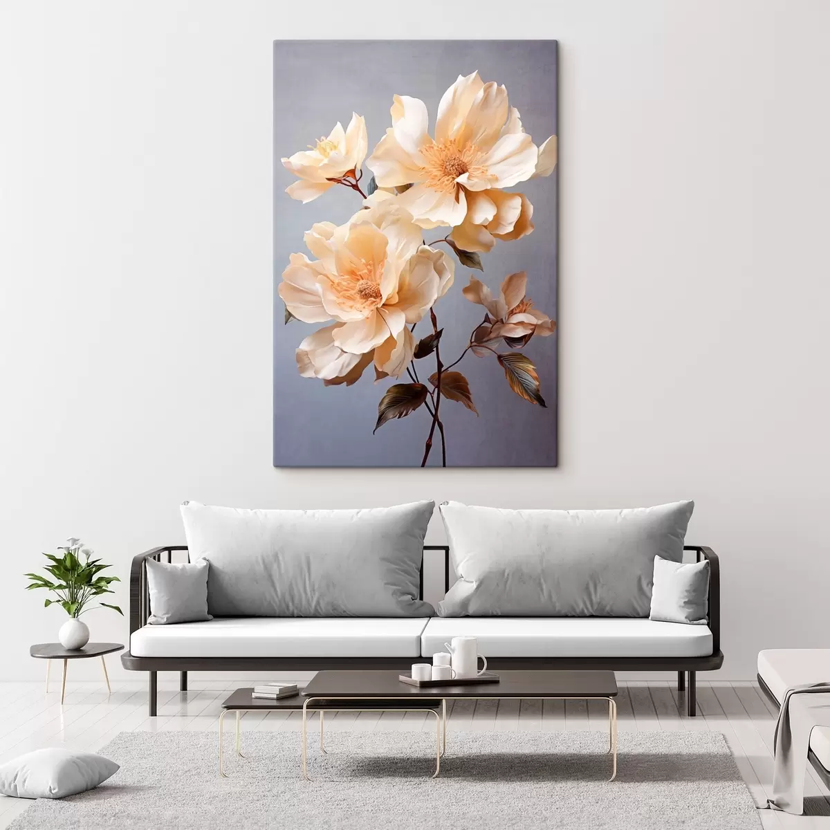 Pictură pe pânză Flori texturate cu pistil portocaliu și frunze portocalii pe fundal gri, lumină moale, elegant, detaliat, realist Nr s45182