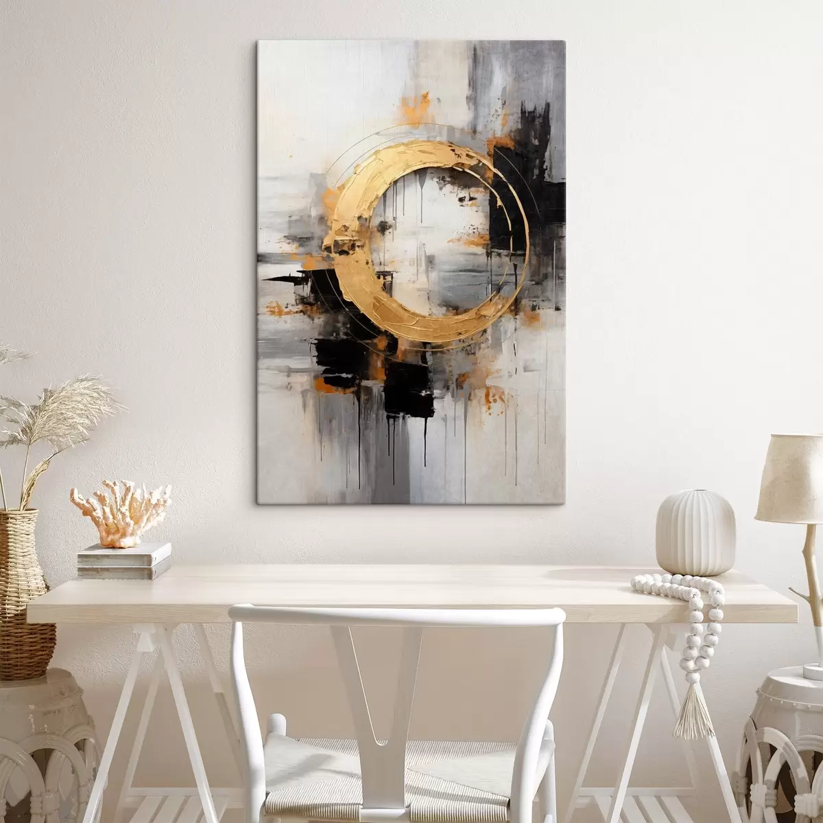 Pictură pe pânză Tablou abstract cu cercuri, linii negre și galbene și un fundal cu tonuri de gri și alb Nr s45186