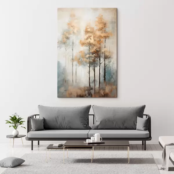 Pictură pe pânză Copaci înalți texturați cu frunze galbene într-o pădure, fundalul este un amestec de tonuri moi de albastru și maro Nr s45187