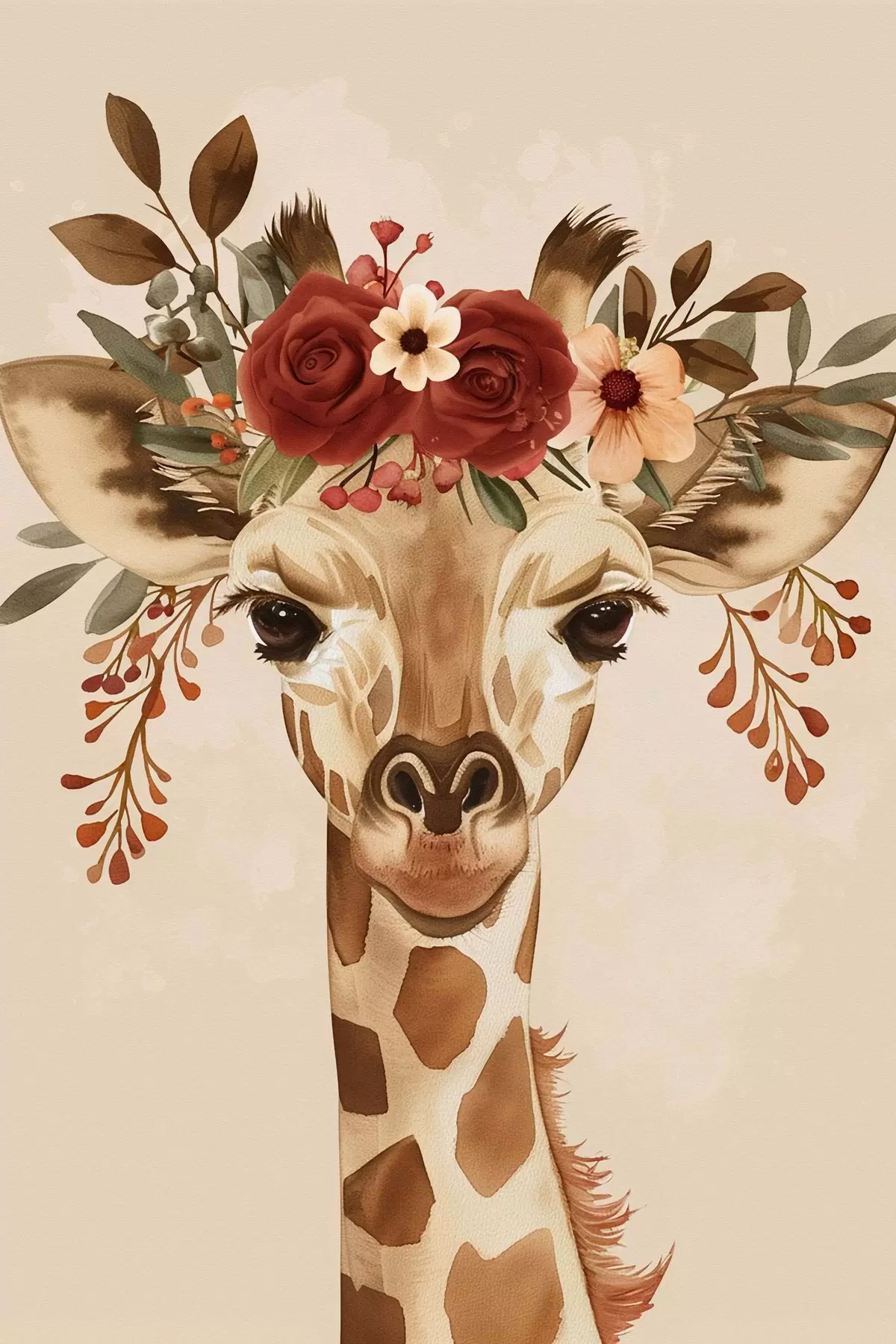 Tablouri Girafă în stil acuarelă cu flori pe cap s45331