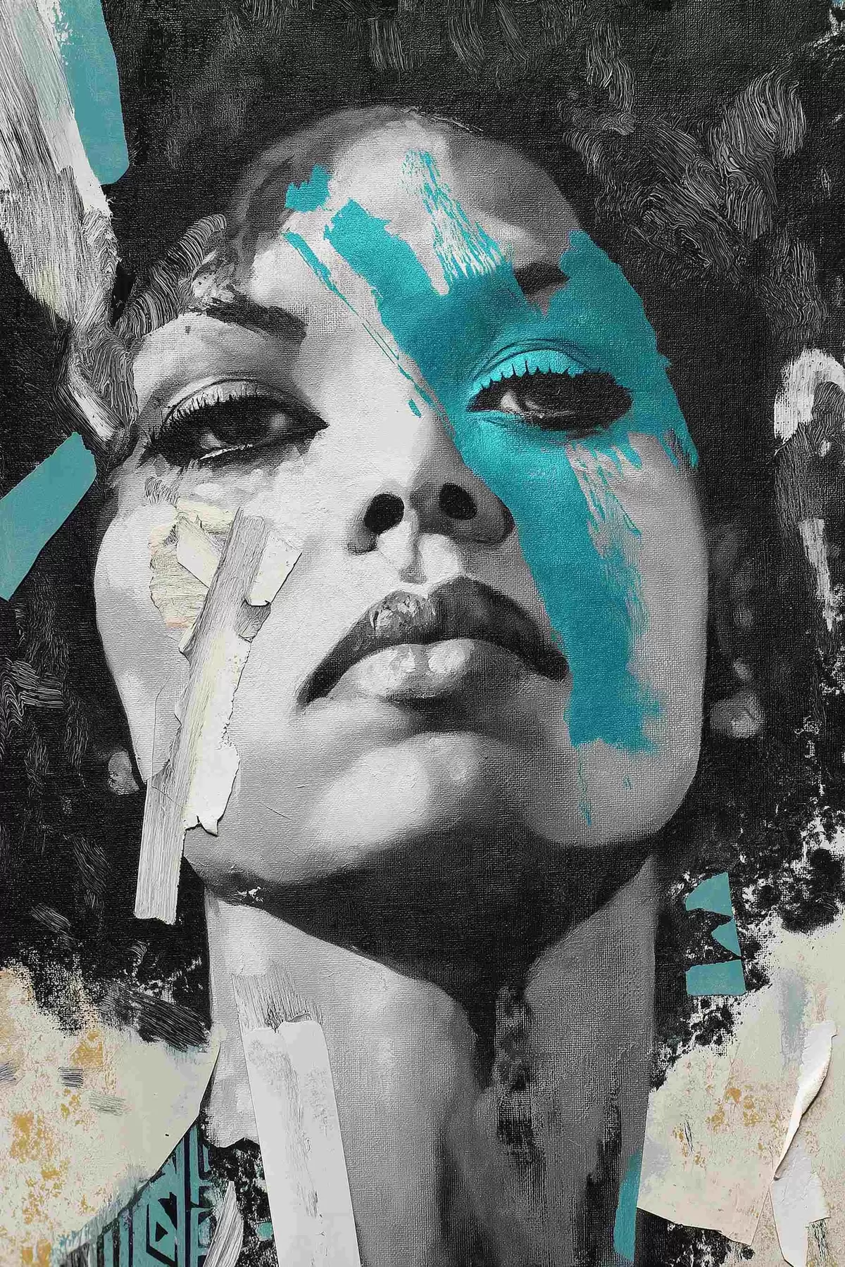 Pictură pe pânză Portret în media mixtă cu fragmente de culori și texturi Nr s45416