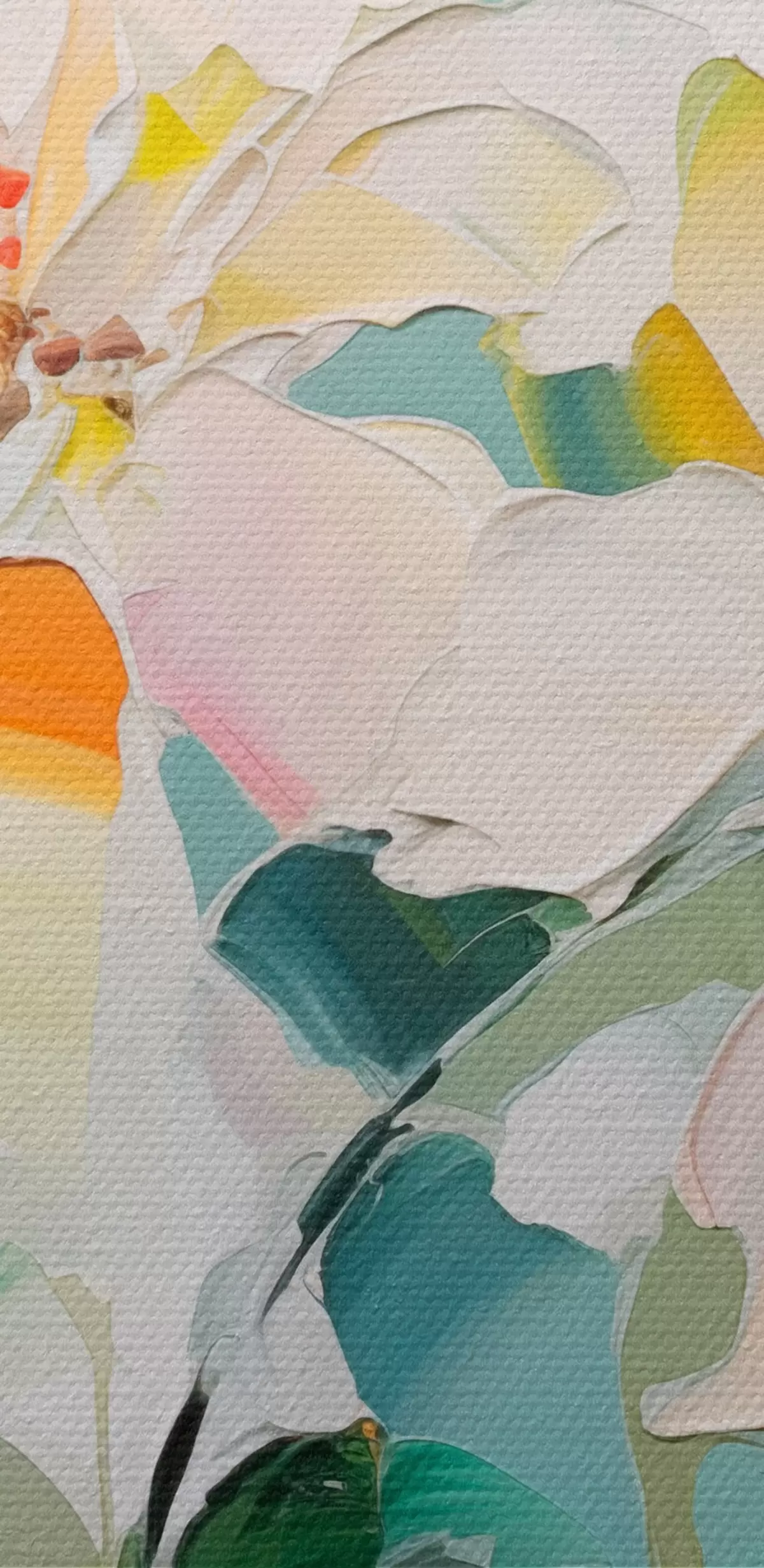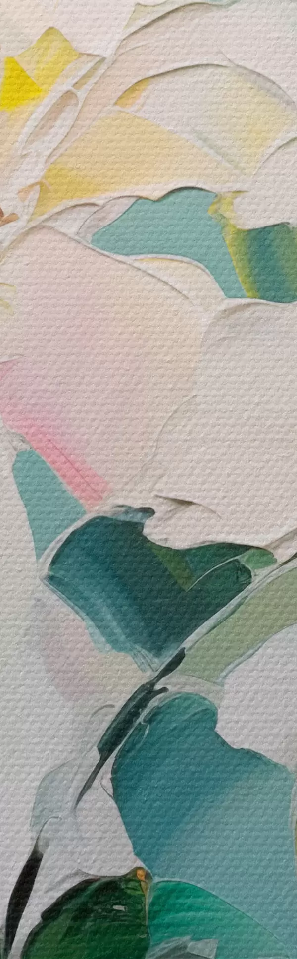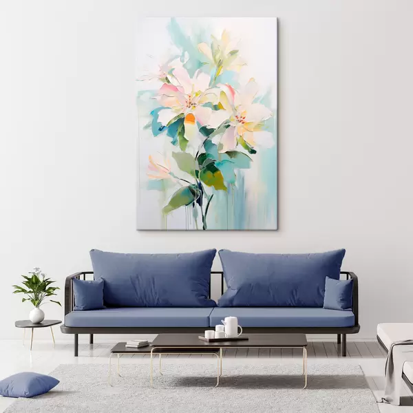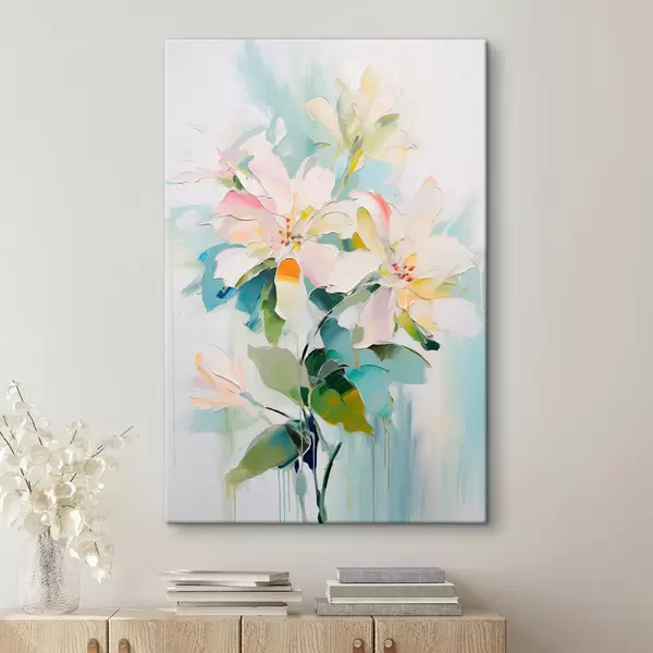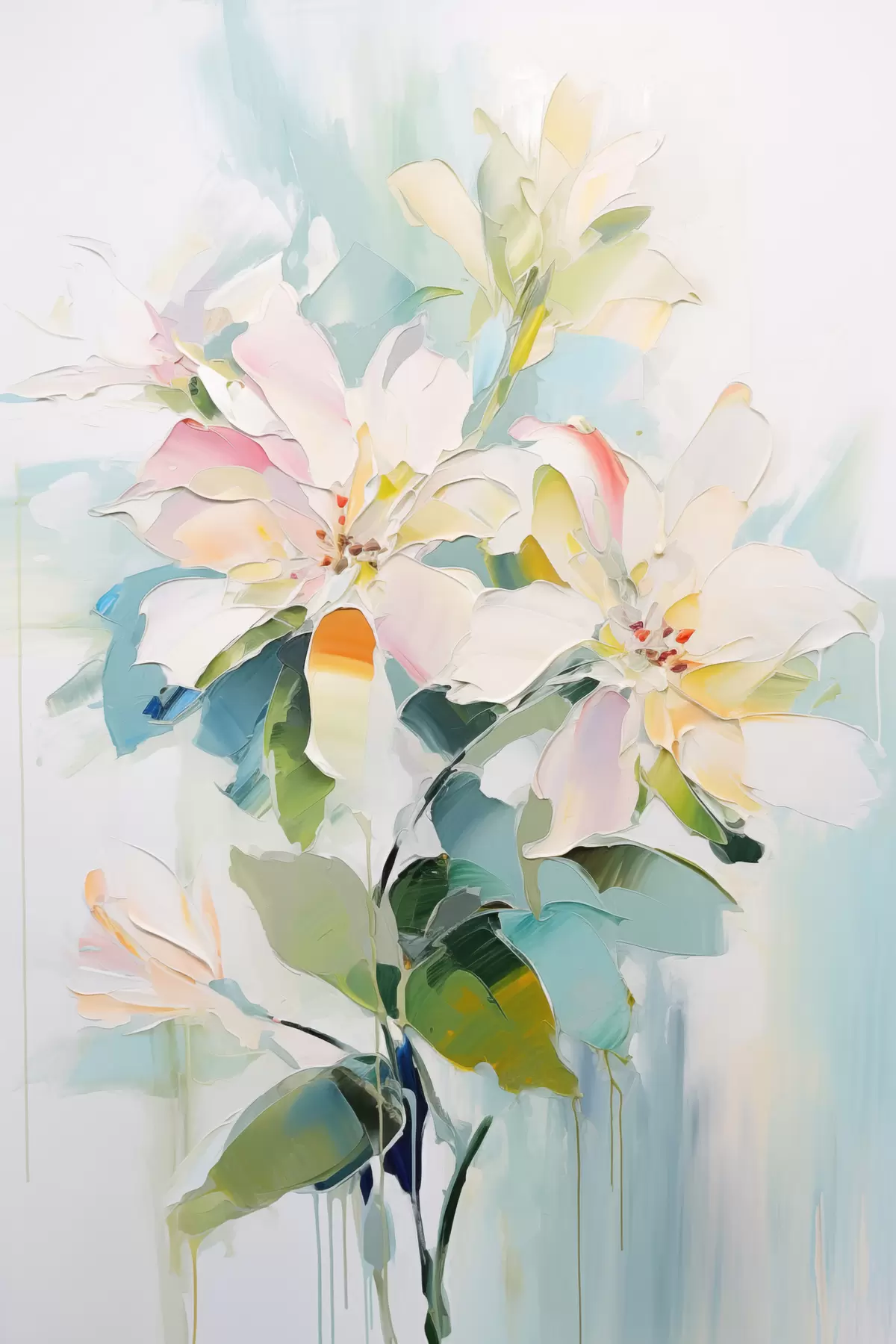 Pictură pe pânză Flori cu accente colorate, frunze verzi, moale brushstrokes ulei pictura imitație, fundal albastru deschis Nr s45549