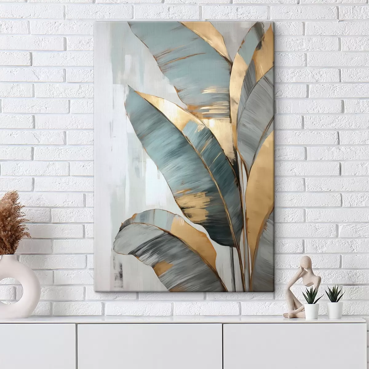 Pictură pe pânză Un set de frunze de banane albastre, gri și galbene cu tușe de pensulă vizibile, pe un fundal abstract alb Nr s45551