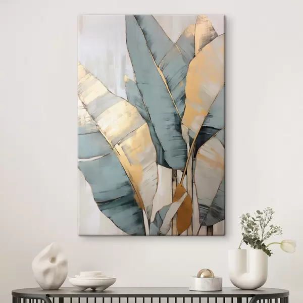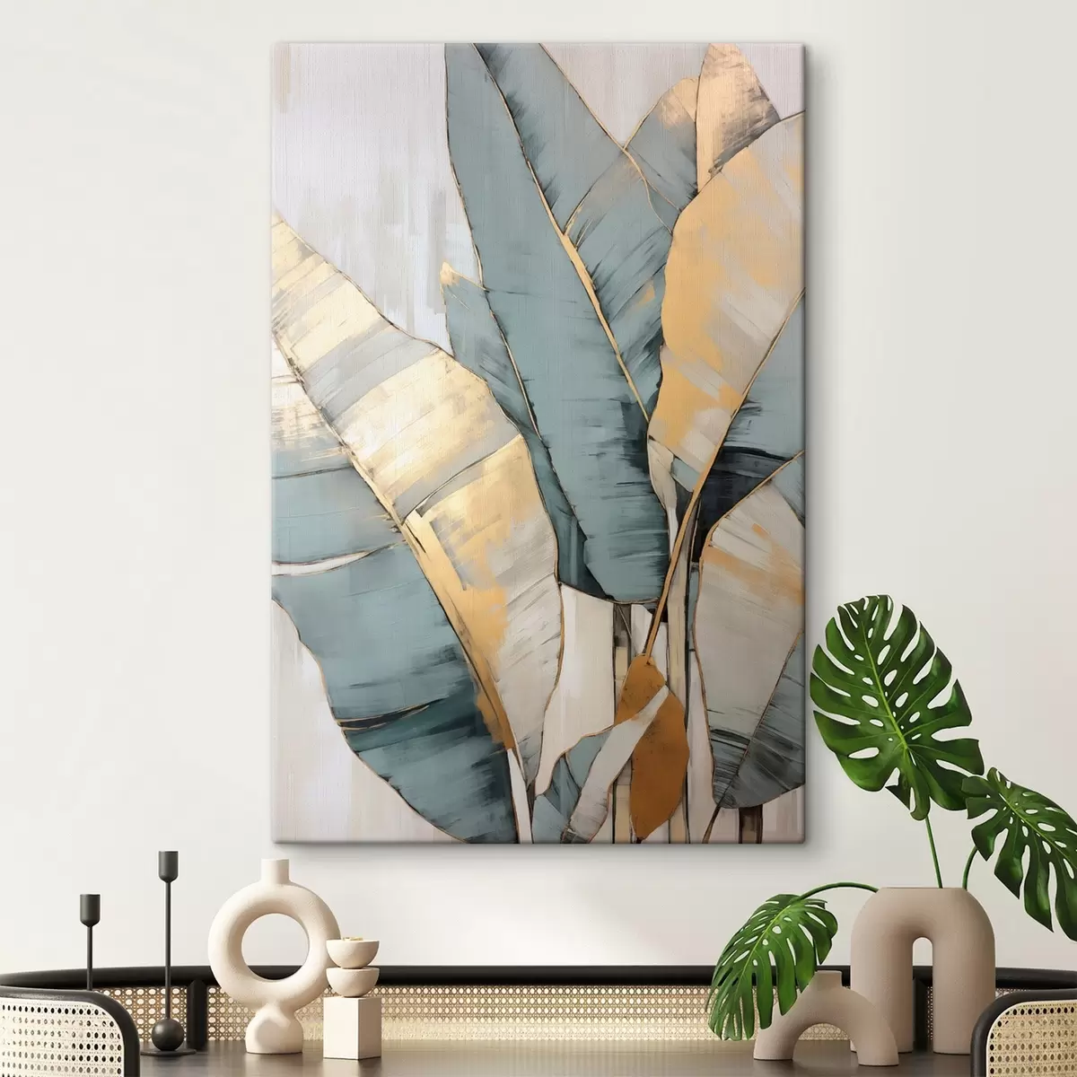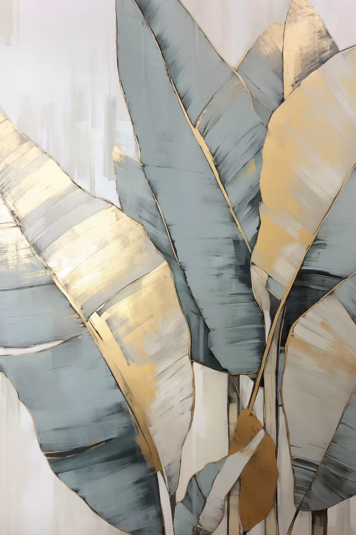 Pictură pe pânză Frunze de banane albastre, gri și galbene cu tușe de pensulă vizibile, pe un fundal alb abstract Nr s45552