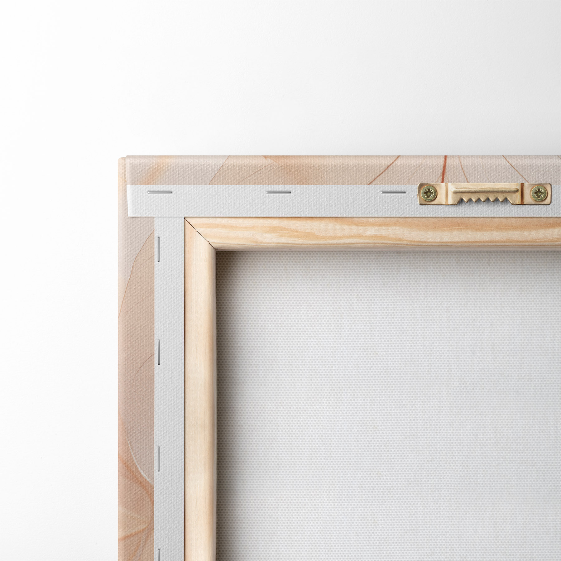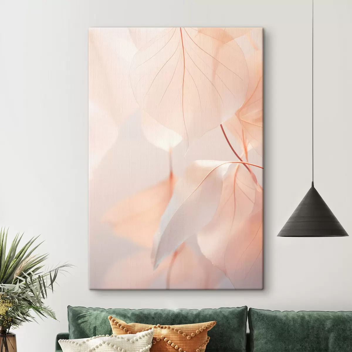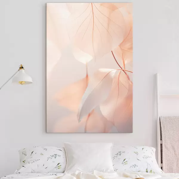 Pictură pe pânză Close-up de frunze translucide cu vene delicate, paleta de culori piersică moale și alb, fundal neclar Nr s45556