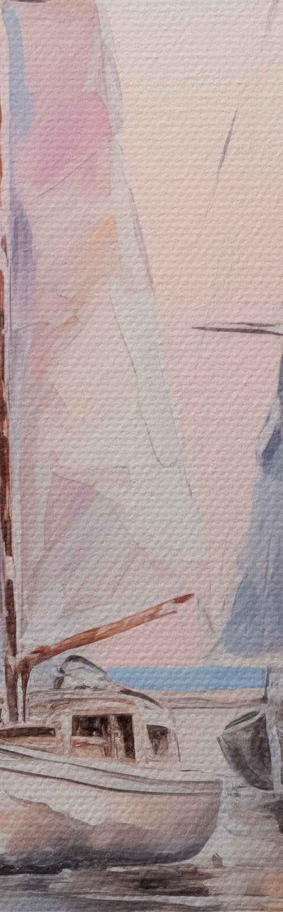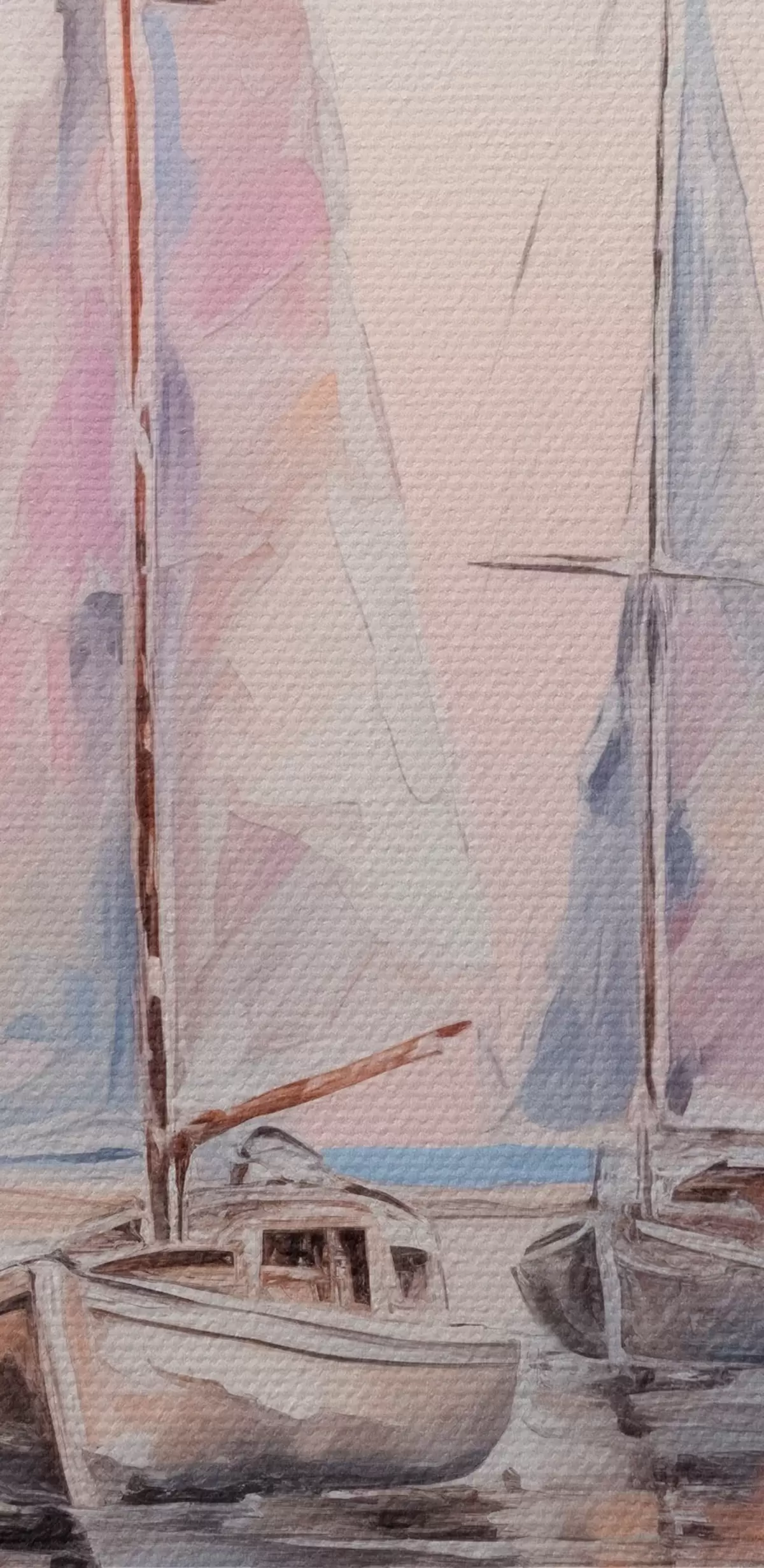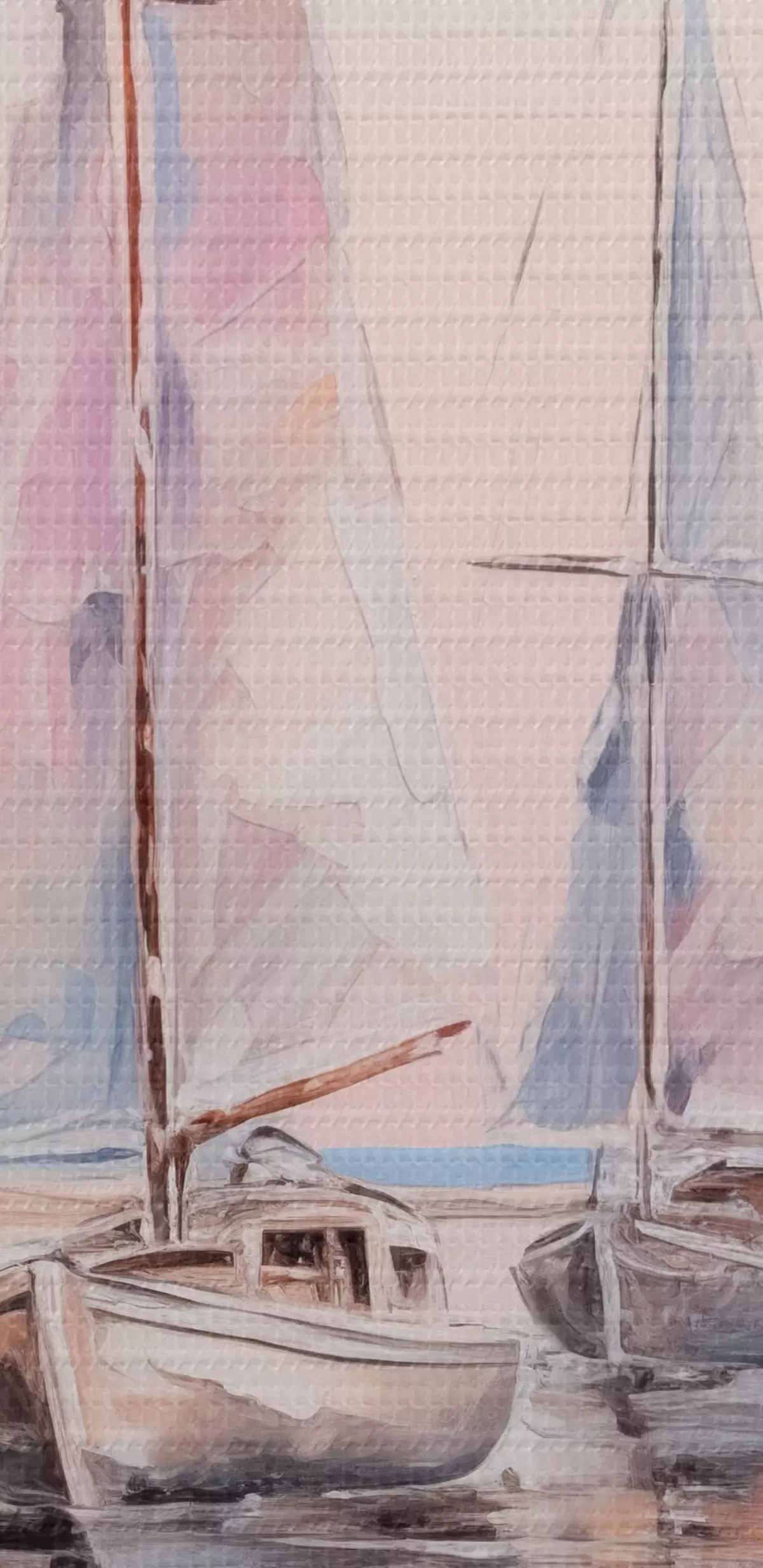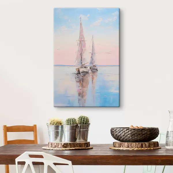 Pictură pe pânză Bărci cu vele roz plutind pe o mare calmă, reflecții ale bărcilor în apă, culori pastelate moi Nr s45558