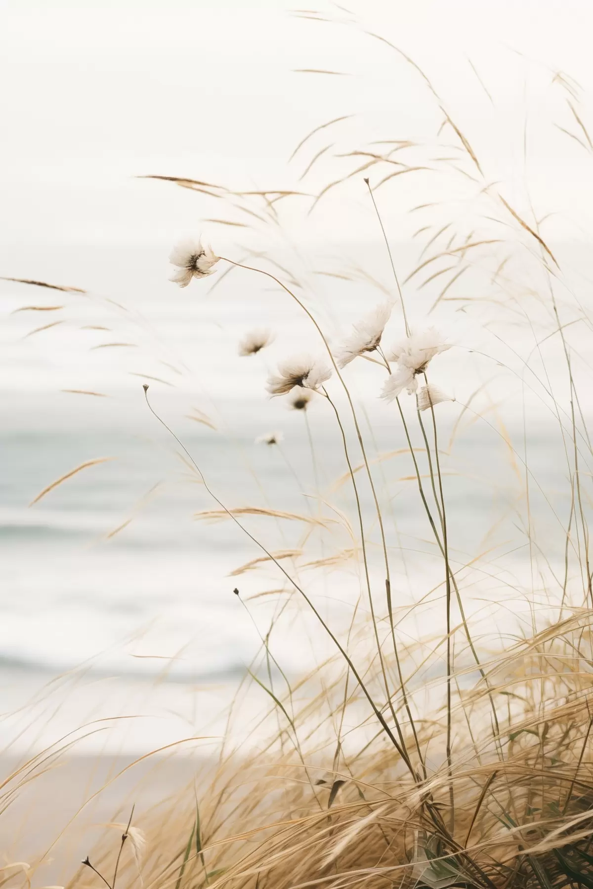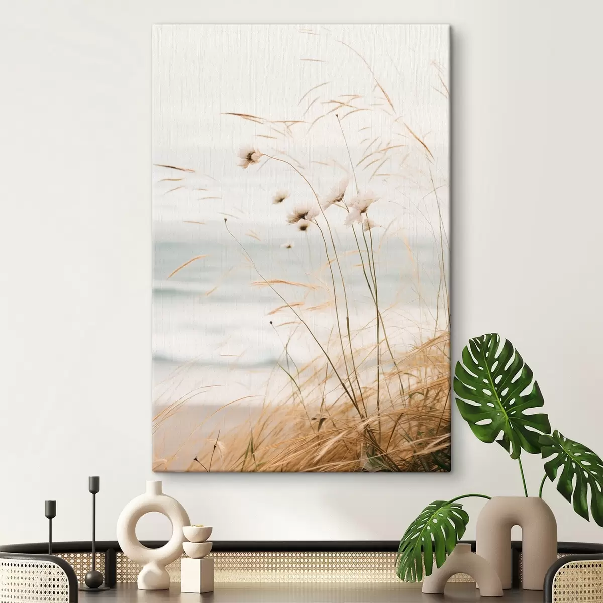 Tablouri Niște iarbă de bumbac și altă iarbă uscată în fața unei mări neclare, paletă de culori moi și atenuate s45562