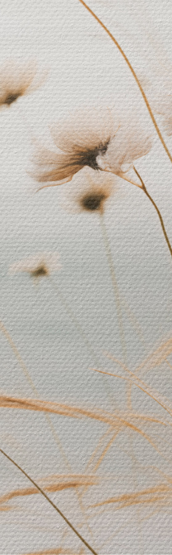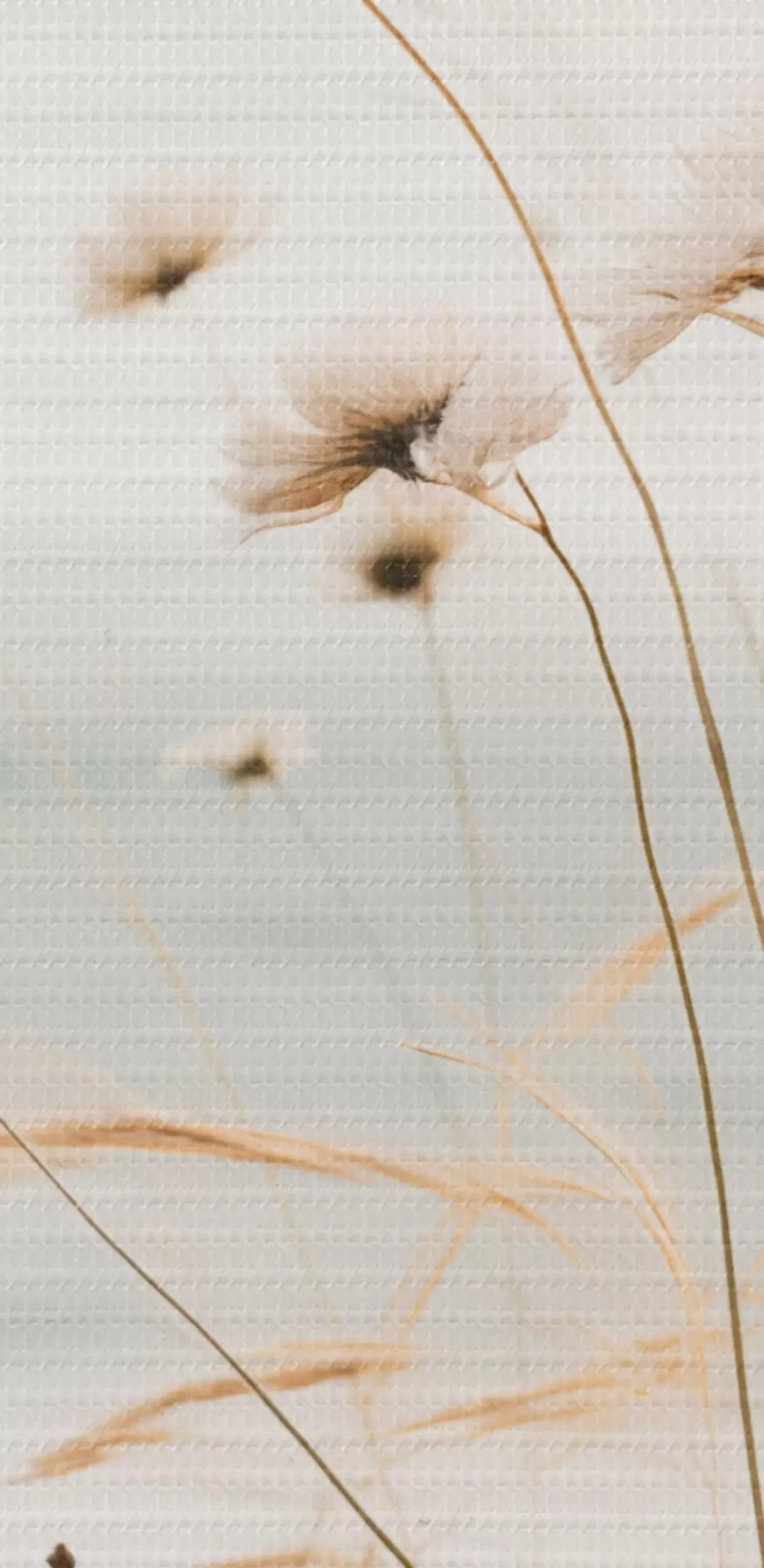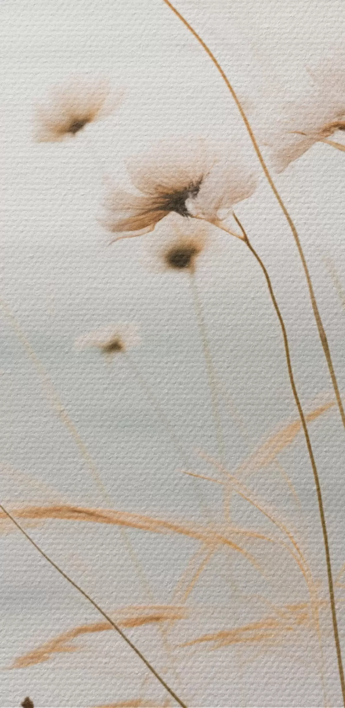 Pictură pe pânză Niște iarbă de bumbac și altă iarbă uscată în fața unei mări neclare, paletă de culori moi și atenuate Nr s45562