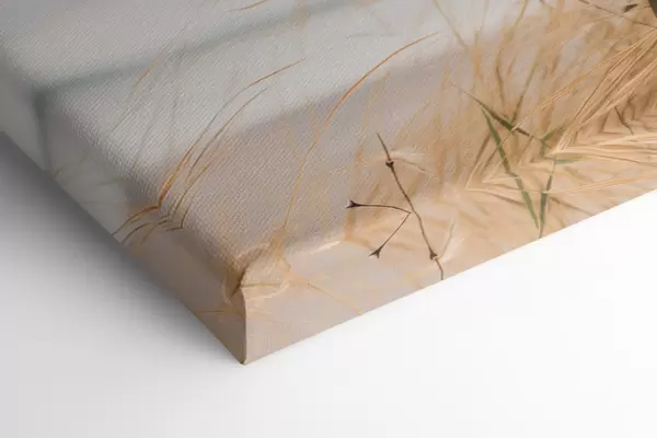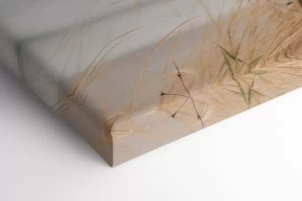 Pictură pe pânză Niște iarbă de bumbac și altă iarbă uscată în fața unei mări neclare, paletă de culori moi și atenuate Nr s45562