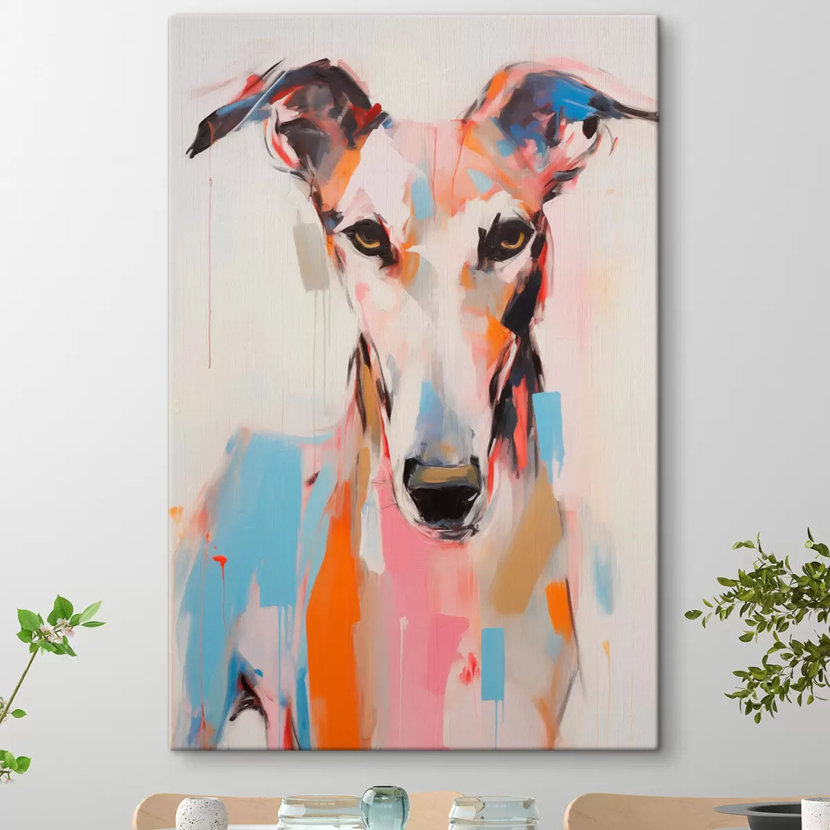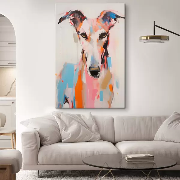 Pictură pe pânză Un câine greyhound, pictat cu culori vibrante precum portocaliu, roz și albastru, pe un fundal alb simplu Nr s45565