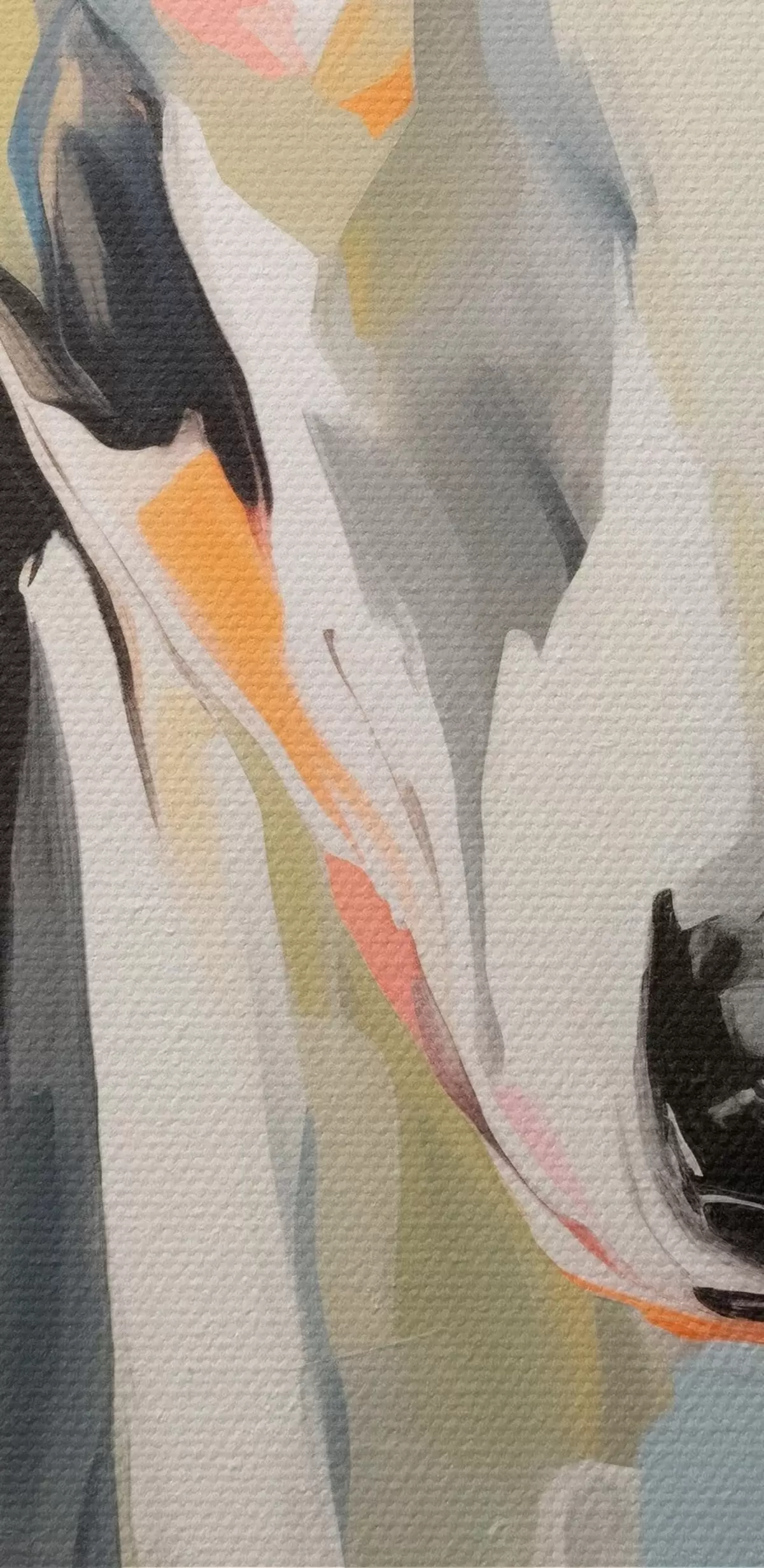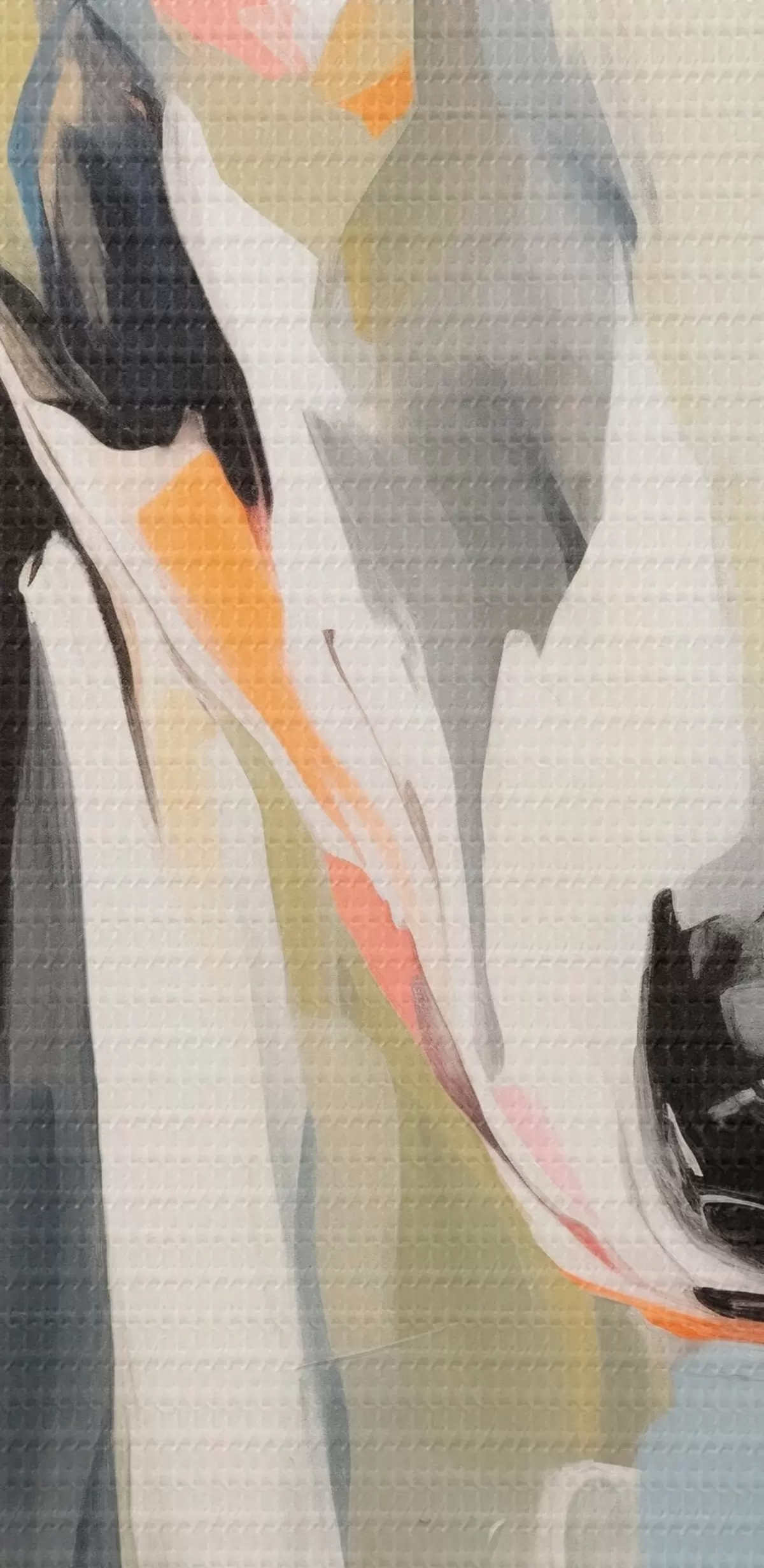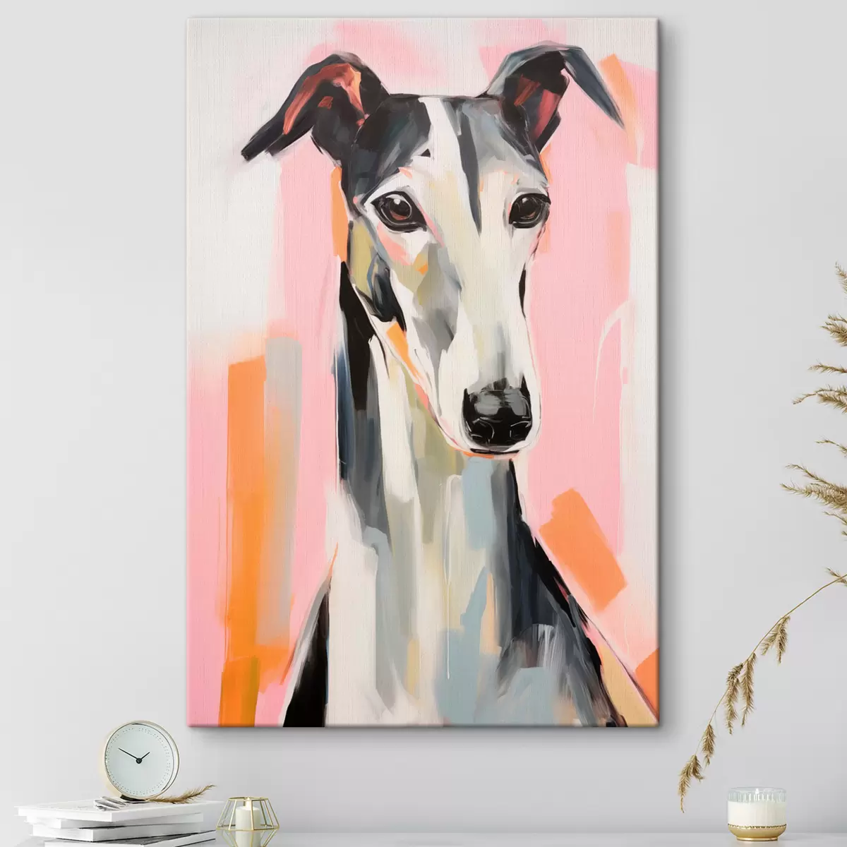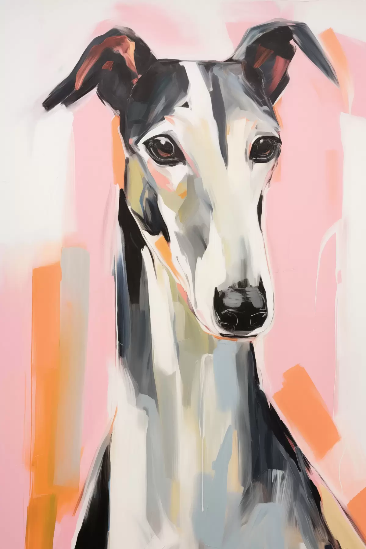Pictură pe pânză Un ogar pe un fundal de roz, portocaliu și alb brushstrokes Nr s45566