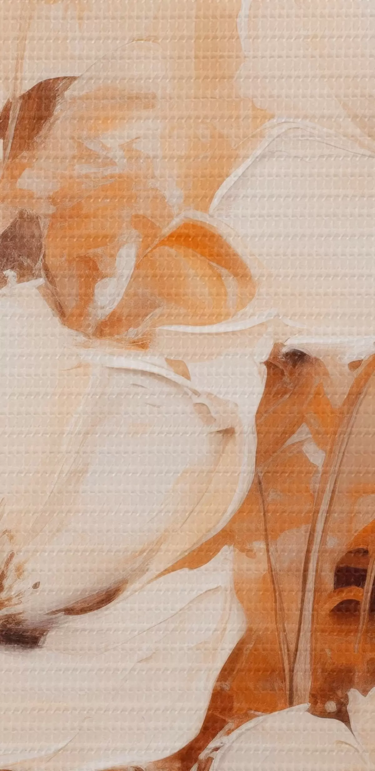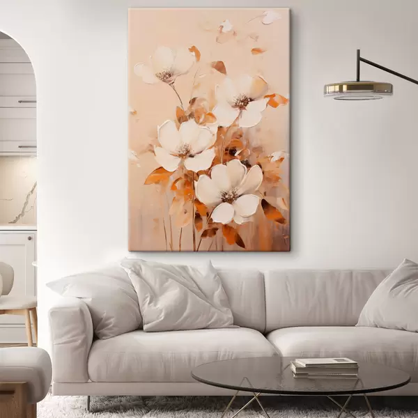 Pictură pe pânză Flori albe cu frunze portocalii, tușe delicate, paletă de culori calde, compoziție elegantă Nr s45573