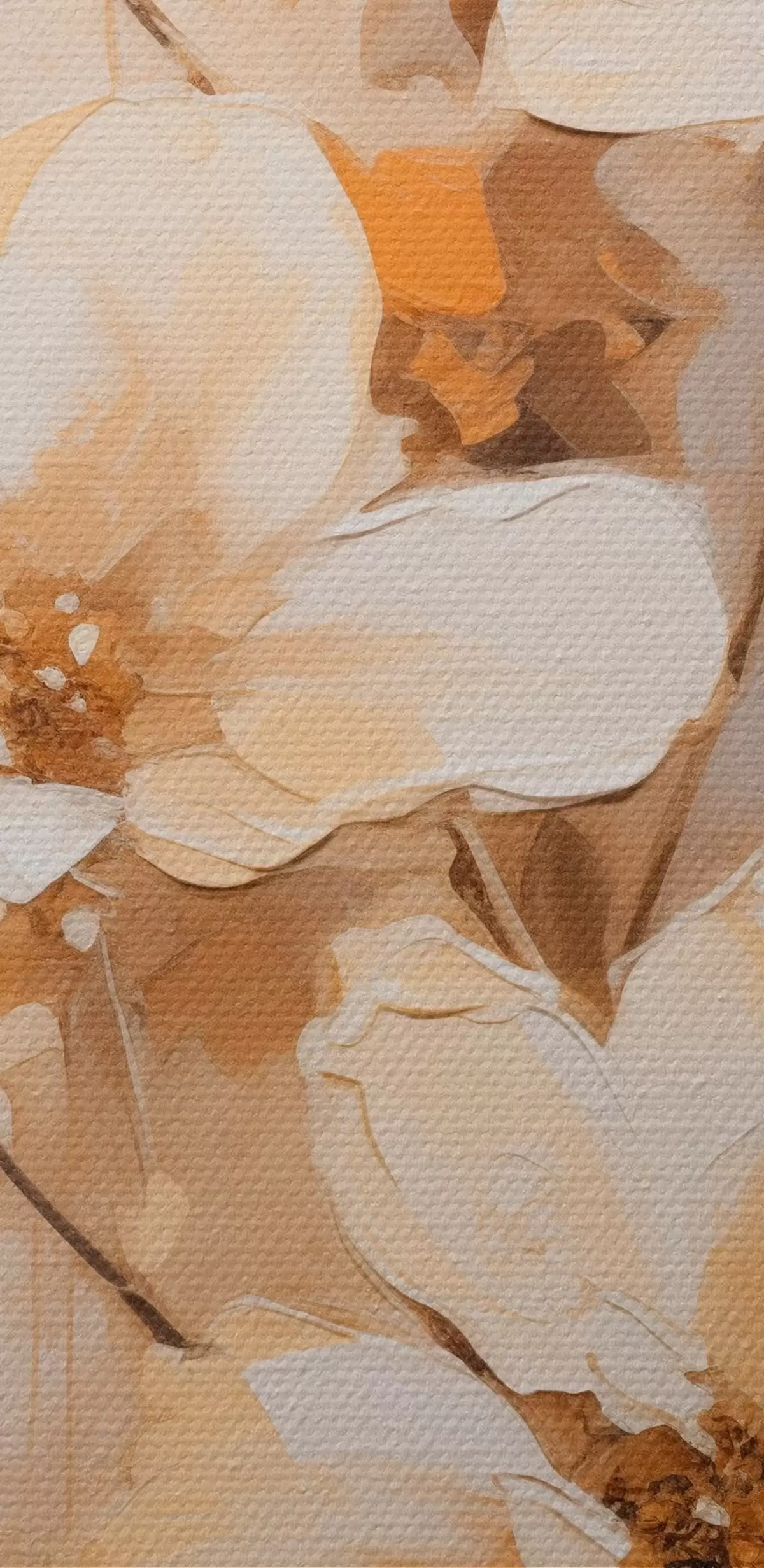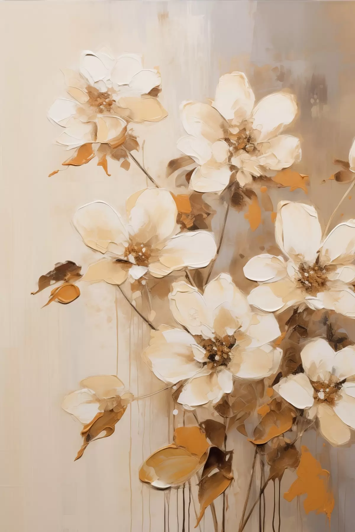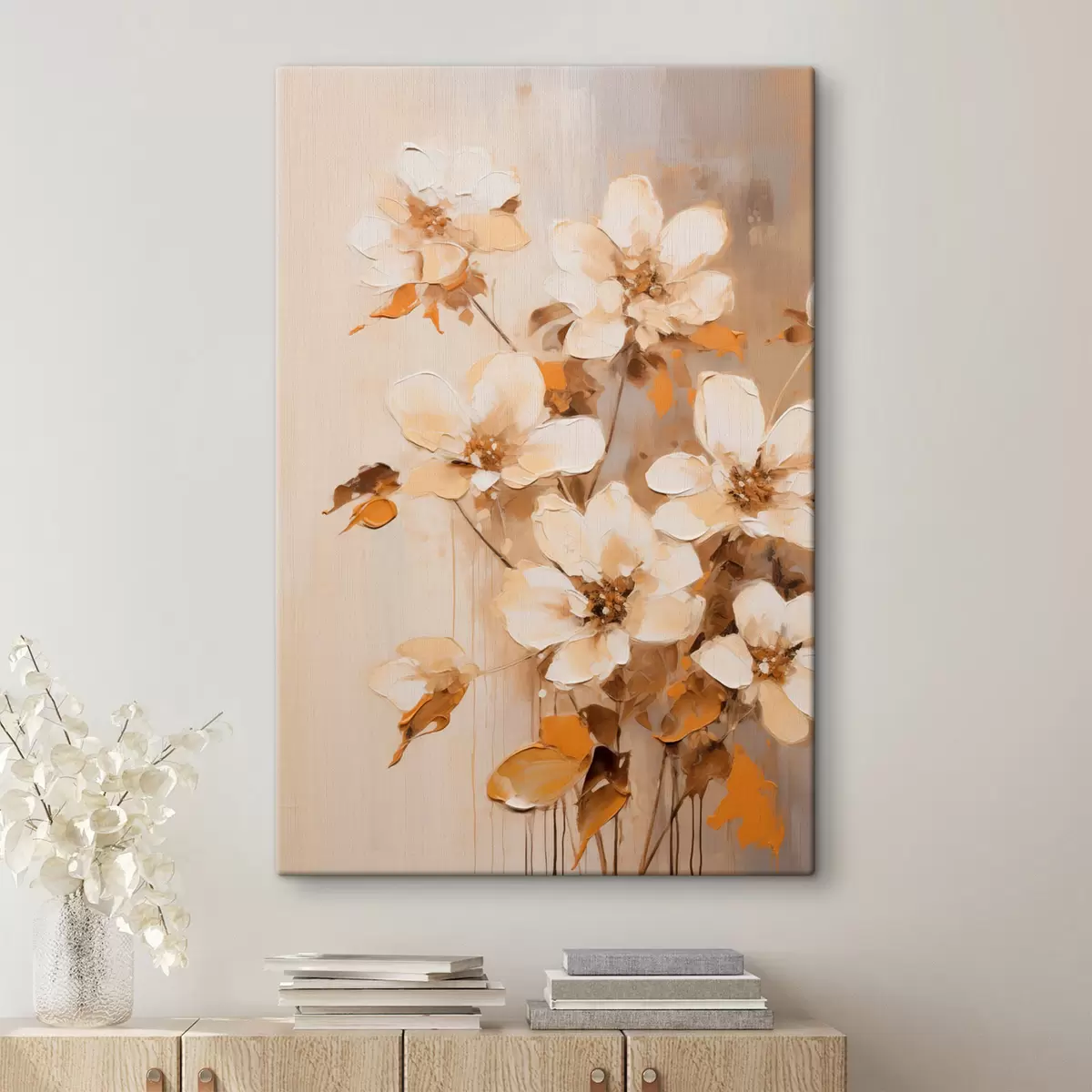 Pictură pe pânză Flori albe cu frunze portocalii, tușe delicate, aranjament floral, artă botanică Nr s45574