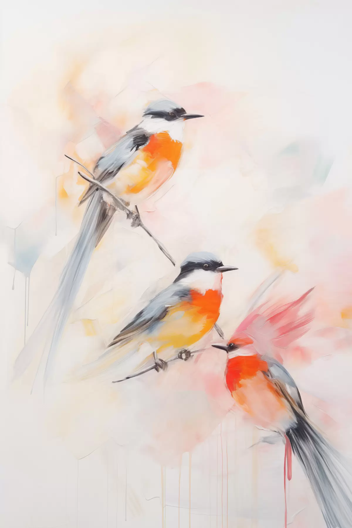 Tablouri Păsări cocoțate pe ramuri, culori pastelate moi, fundal deschis cu nuanțe de roz și alb s45577