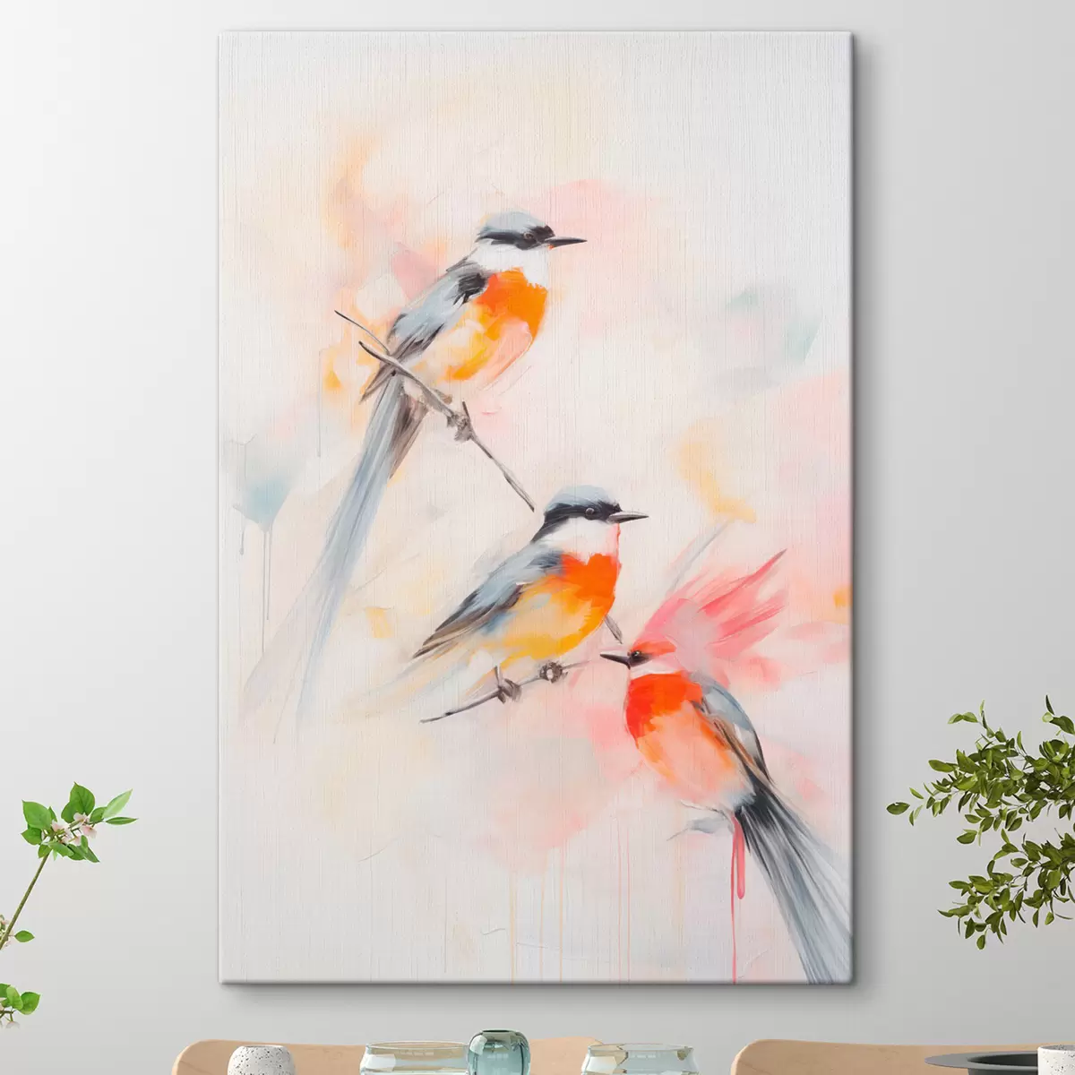 Pictură pe pânză Păsări cocoțate pe ramuri, culori pastelate moi, fundal deschis cu nuanțe de roz și alb Nr s45577
