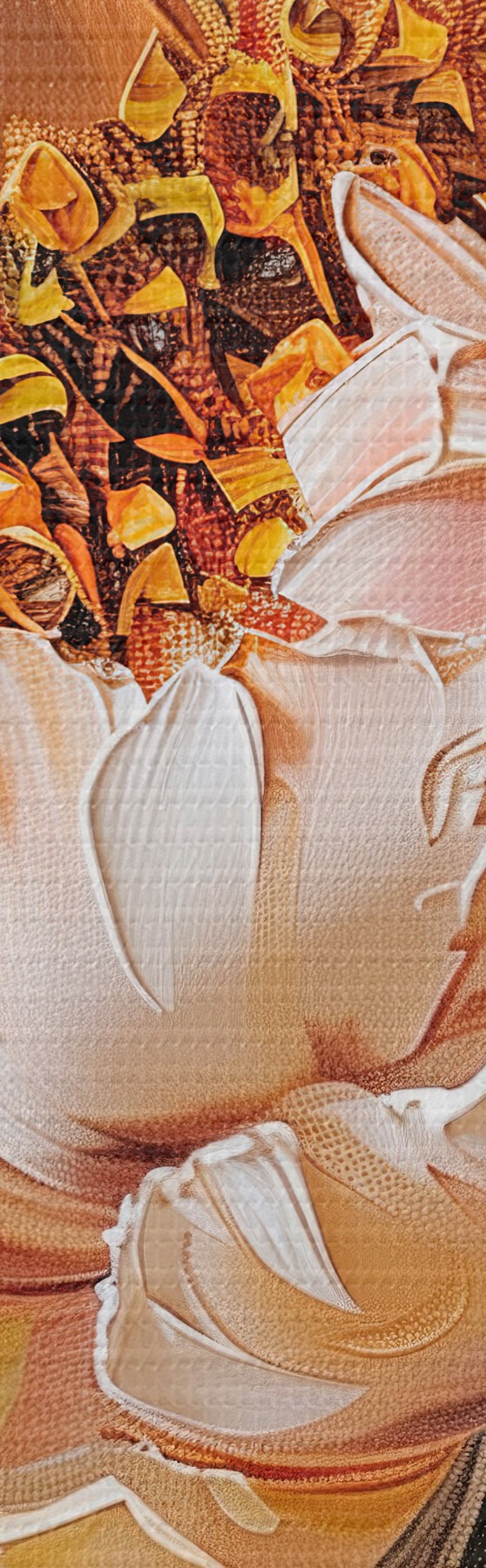 Trei tipuri de materiale sunt disponibile pentru comandă: Economic Canvas - un material dens și durabil pentru imprimarea digitală, identic cu pânza de pictor, suprafață impermeabilă, reproducere realistă a detaliilor, material cu granulație medie. Premium Canvas - textura seamănă cu cea a pânzei unui pictor (fire mici împletite). Reproducere moale, detaliată a imaginii pe o suprafață mată. Eco-Premium - țesătură 100% bumbac de înaltă calitate. Datorită fibrelor naturale de bumbac, materialul este durabil și rezistent la uzură. Reproducere excelentă a culorilor și a detaliilor.