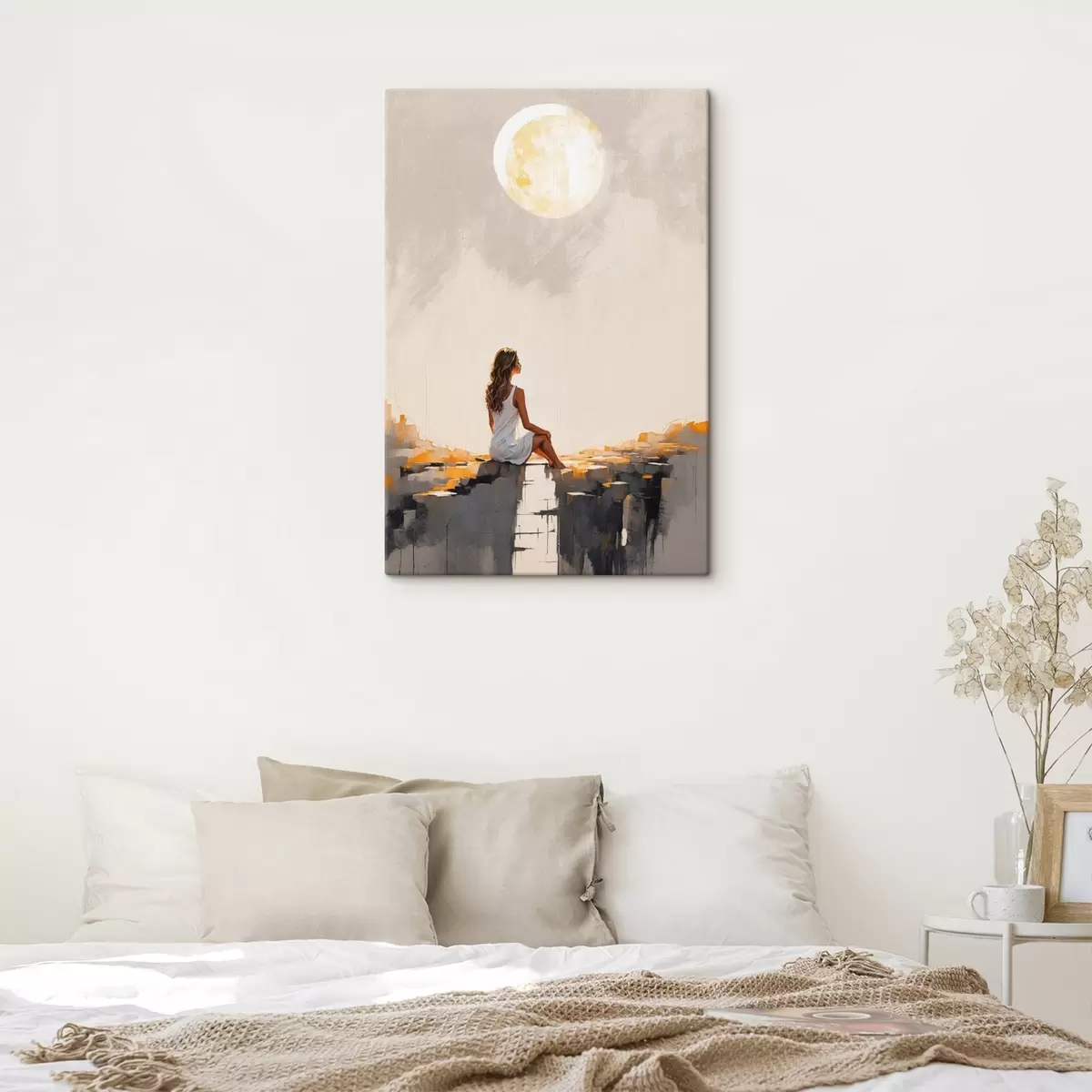 Tablouri Fată într-o rochie albă stând sub o lună mare s45621
