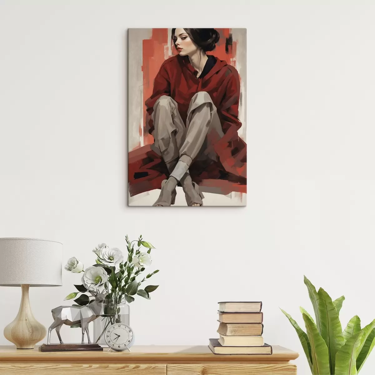 Pictură pe pânză Fată în mantie roșie stând cu picioarele îndoite Nr s45624