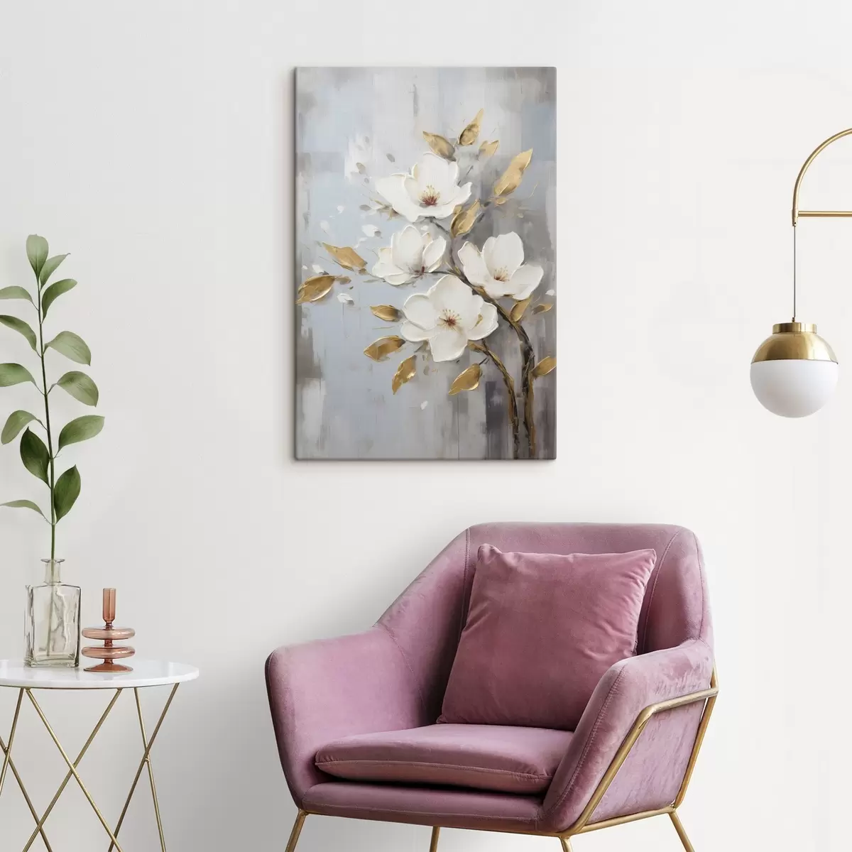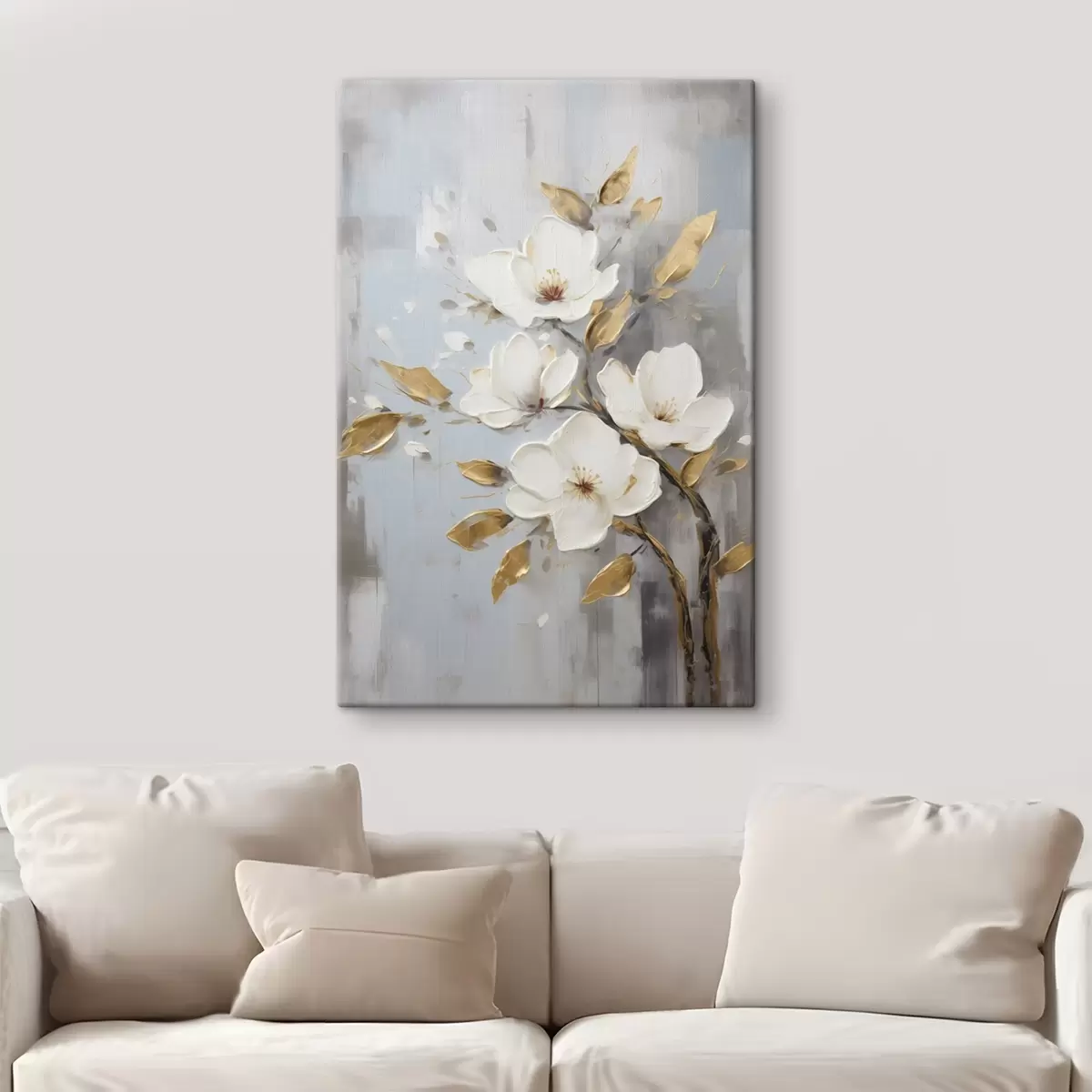 Pictură pe pânză Ramură cu flori albe și frunze galben-portocalii Nr s45692
