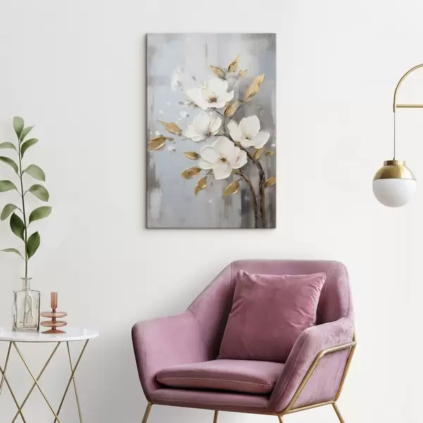 Pictură pe pânză Ramură cu flori albe și frunze galben-portocalii Nr s45692