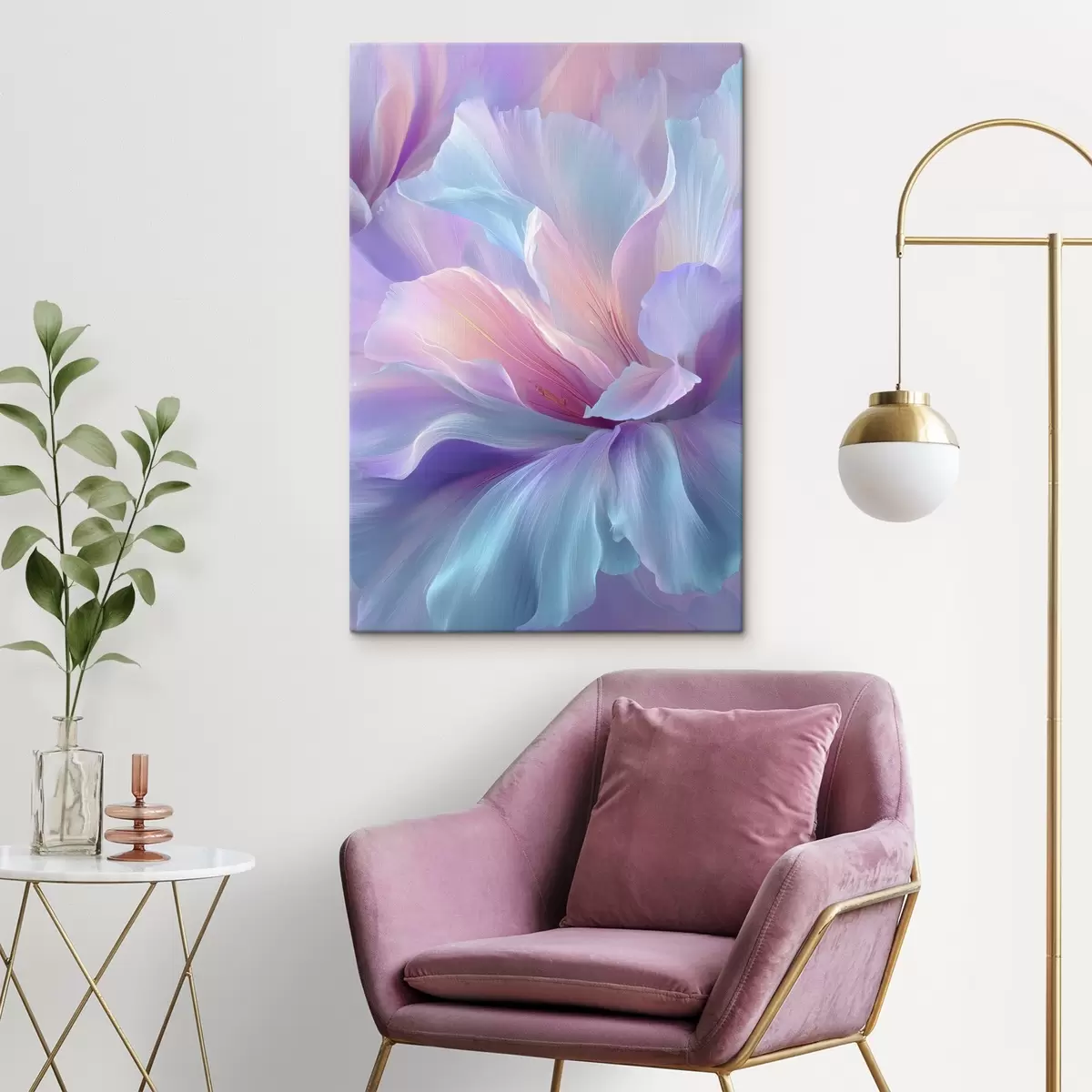 Pictură pe pânză o floare delicată, de basm, cu petale în nuanțe de violet, albastru și roz. Nr s45710