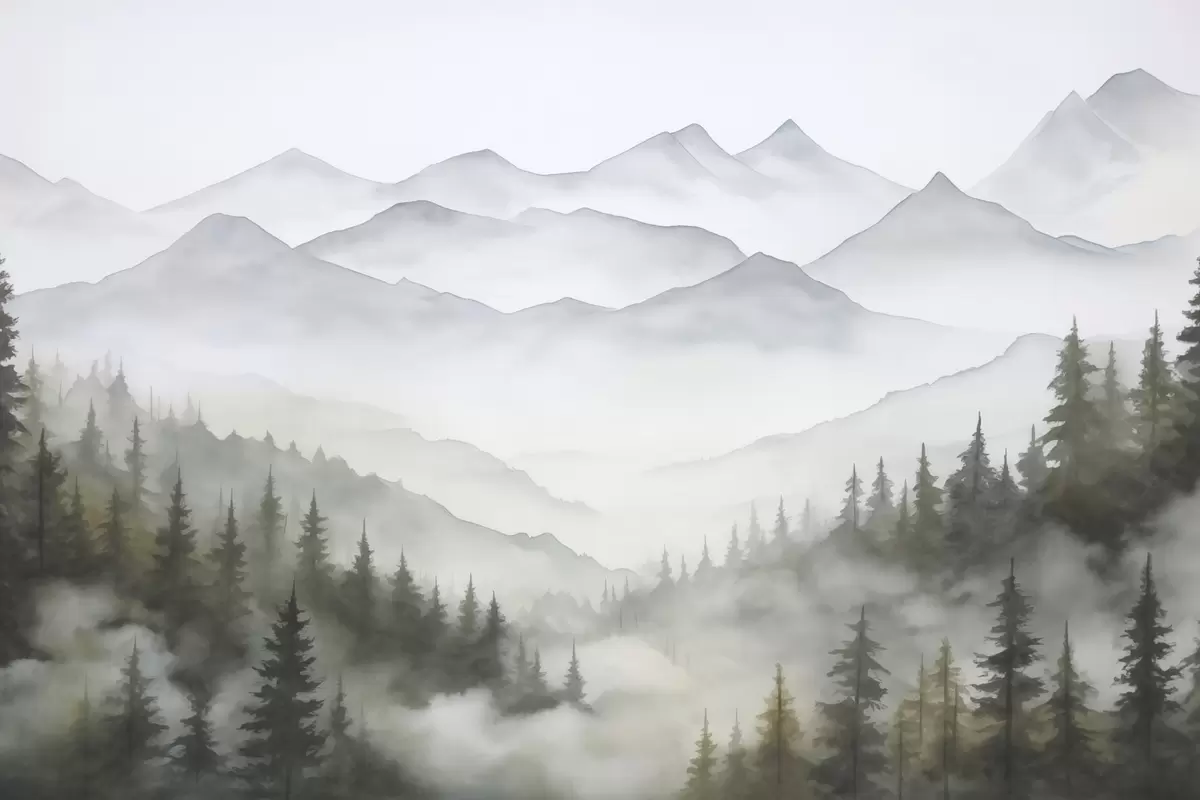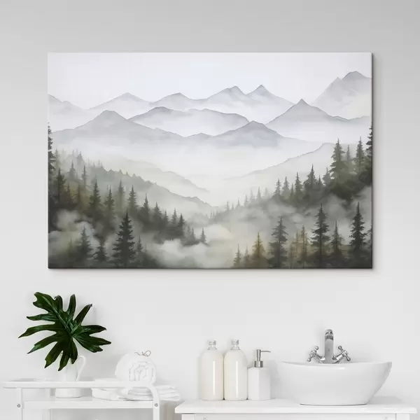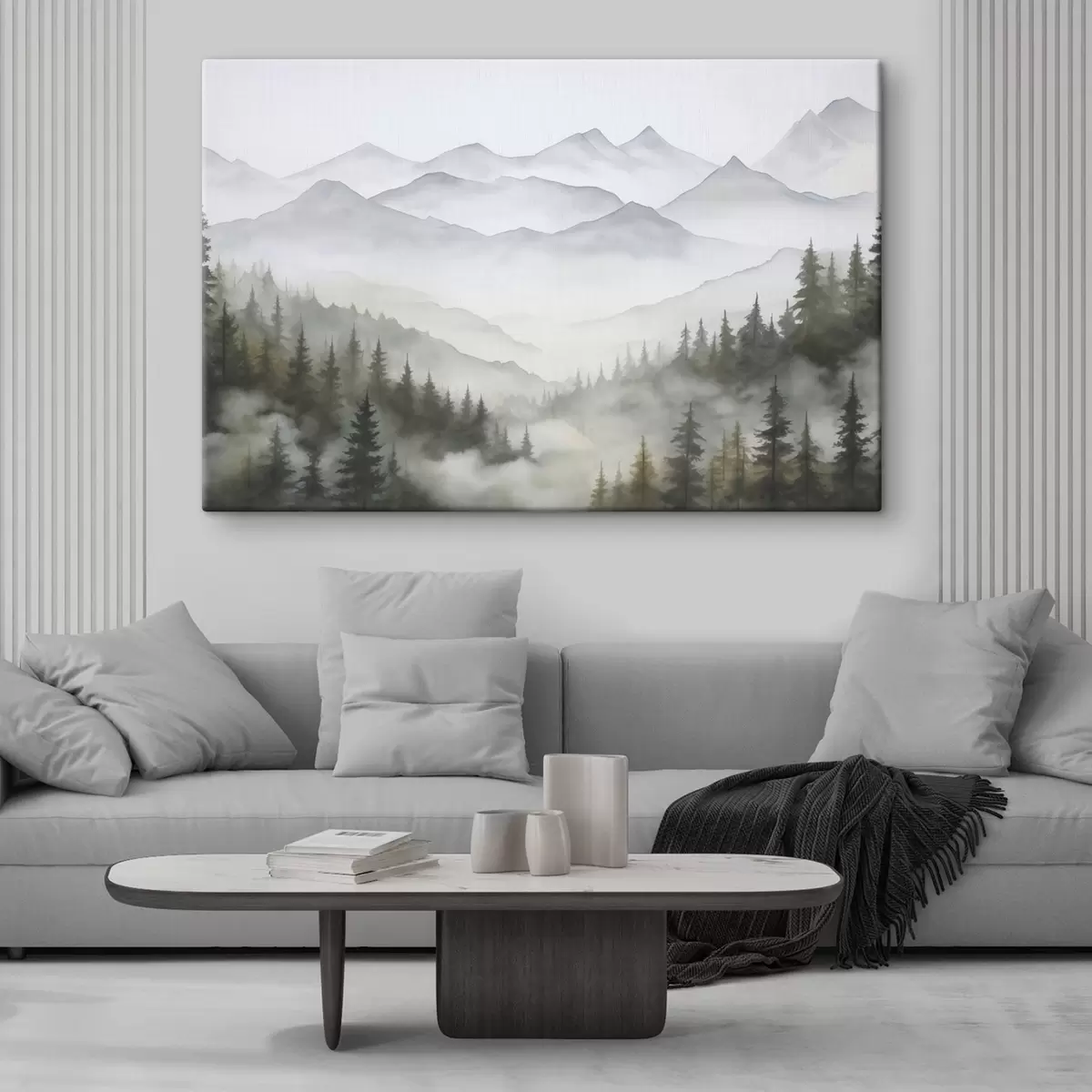 Pictură pe pânză Pădure în ceață în fața munților Nr s45774