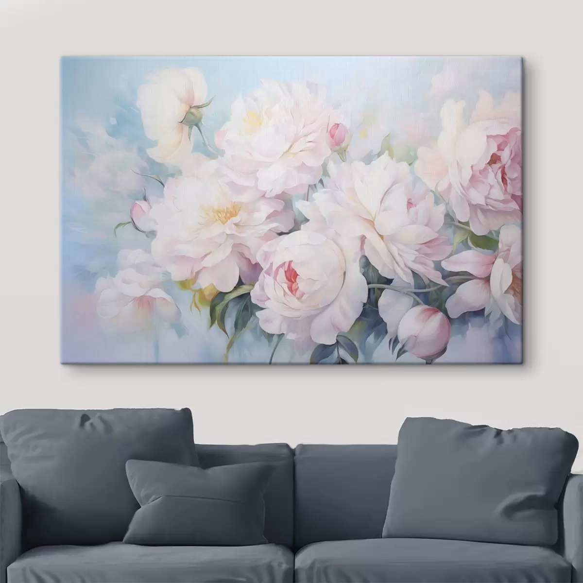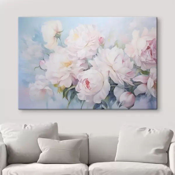 Pictură pe pânză Bujori roz delicați pe un fundal albastru ca cerul Nr s45813