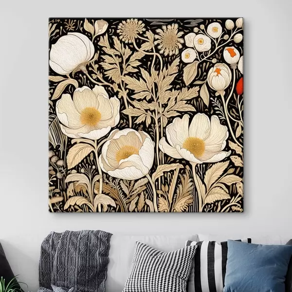 Pictură pe pânză Flori crem și ierburi pe fundal negru Nr s45816